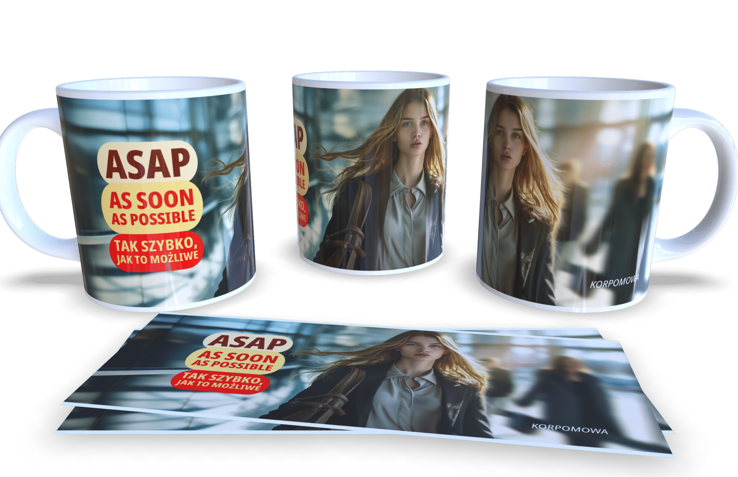 Kubek zdobi intrygująca grafika przedstawiająca spieszącą się kobietę w otoczeniu biurowym. Postać emanuje energią i determinacją, jej sylwetka doskonale oddaje pośpiech i mnogość zadań typowych dla korporacyjnego środowiska. Detale takie jak teczka w ręku, zegarek na nadgarstku czy charakterystyczne elementy biurowego wystroju w tle tworzą obraz pełen dynamiki i humoru. Całość kompozycji doskonale ilustruje presję czasu kryjącą się za skrótem „ASAP”.