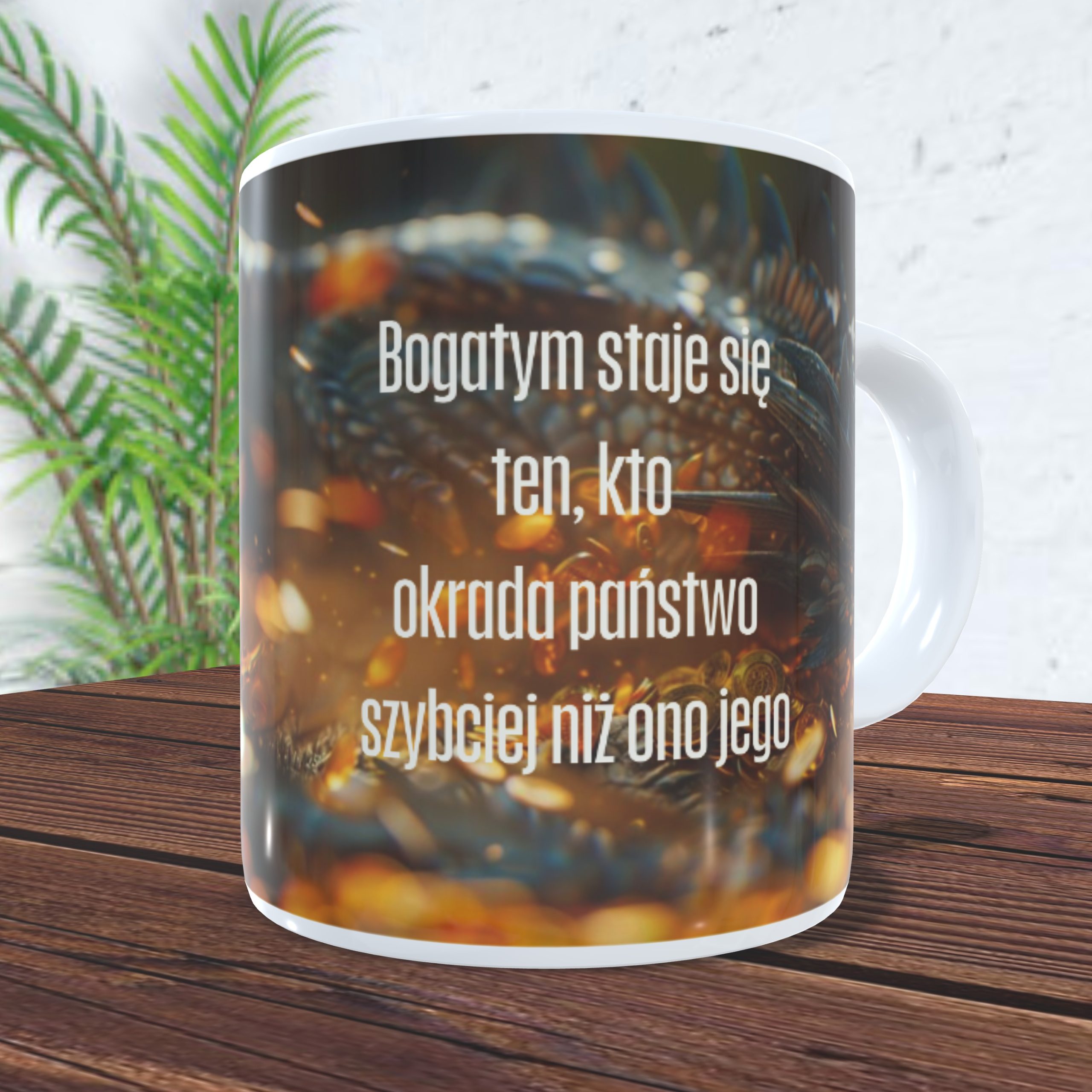 Kubek „Bogatym staje się ten, kto okrada państwo szybciej niż ono jego” – Humor i Refleksja