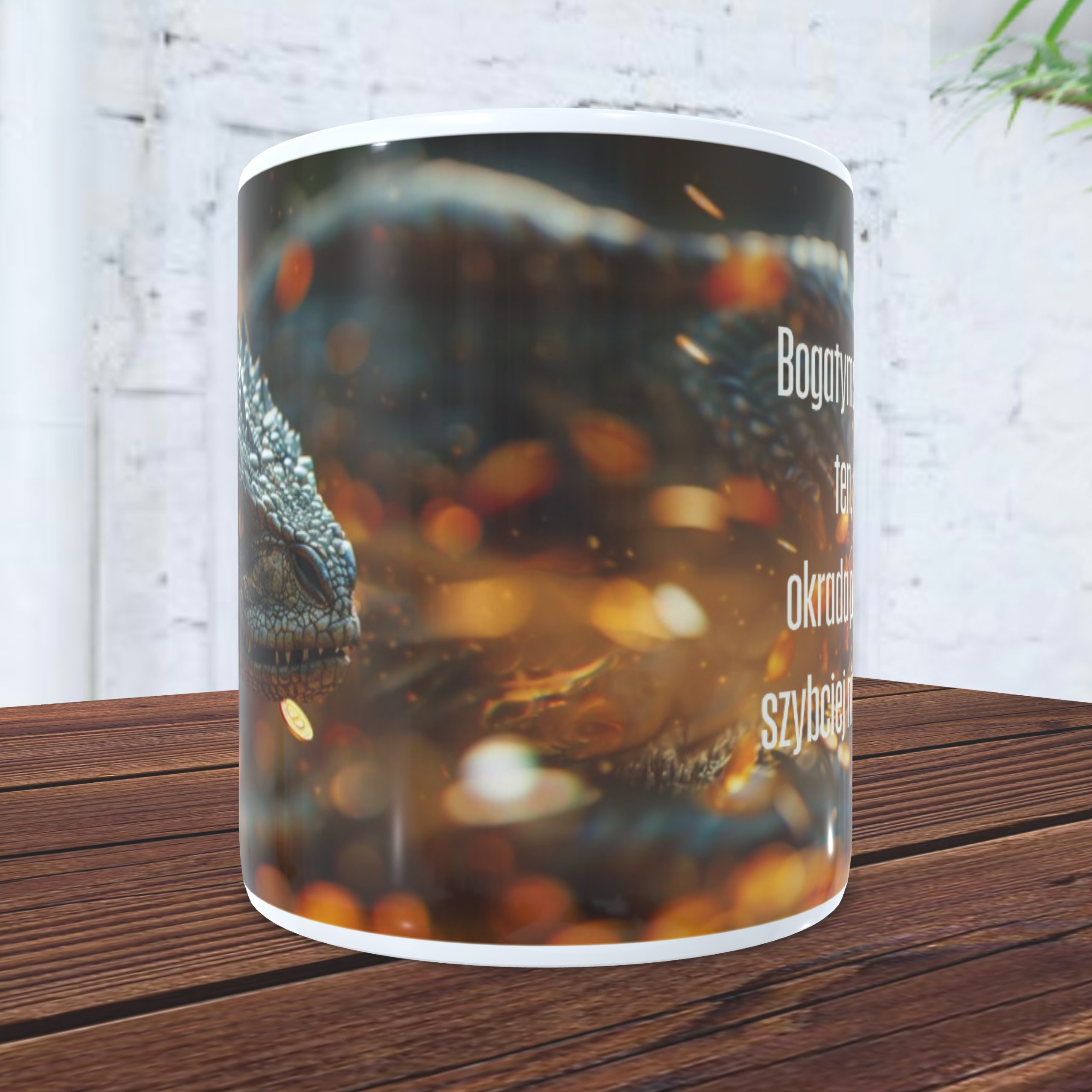 Kubek „Bogatym staje się ten, kto okrada państwo szybciej niż ono jego” łączy w sobie zabawne przesłanie z efektownym designem. Smok otoczony złotem i pieniędzmi symbolizuje chciwość i nieuczciwe bogactwo, co w połączeniu z napisem daje mocny przekaz o współczesnych realiach. Taki design przyciąga wzrok i wywołuje uśmiech, jednocześnie skłaniając do refleksji nad kondycją społeczeństwa i systemu ekonomicznego.
