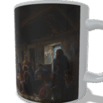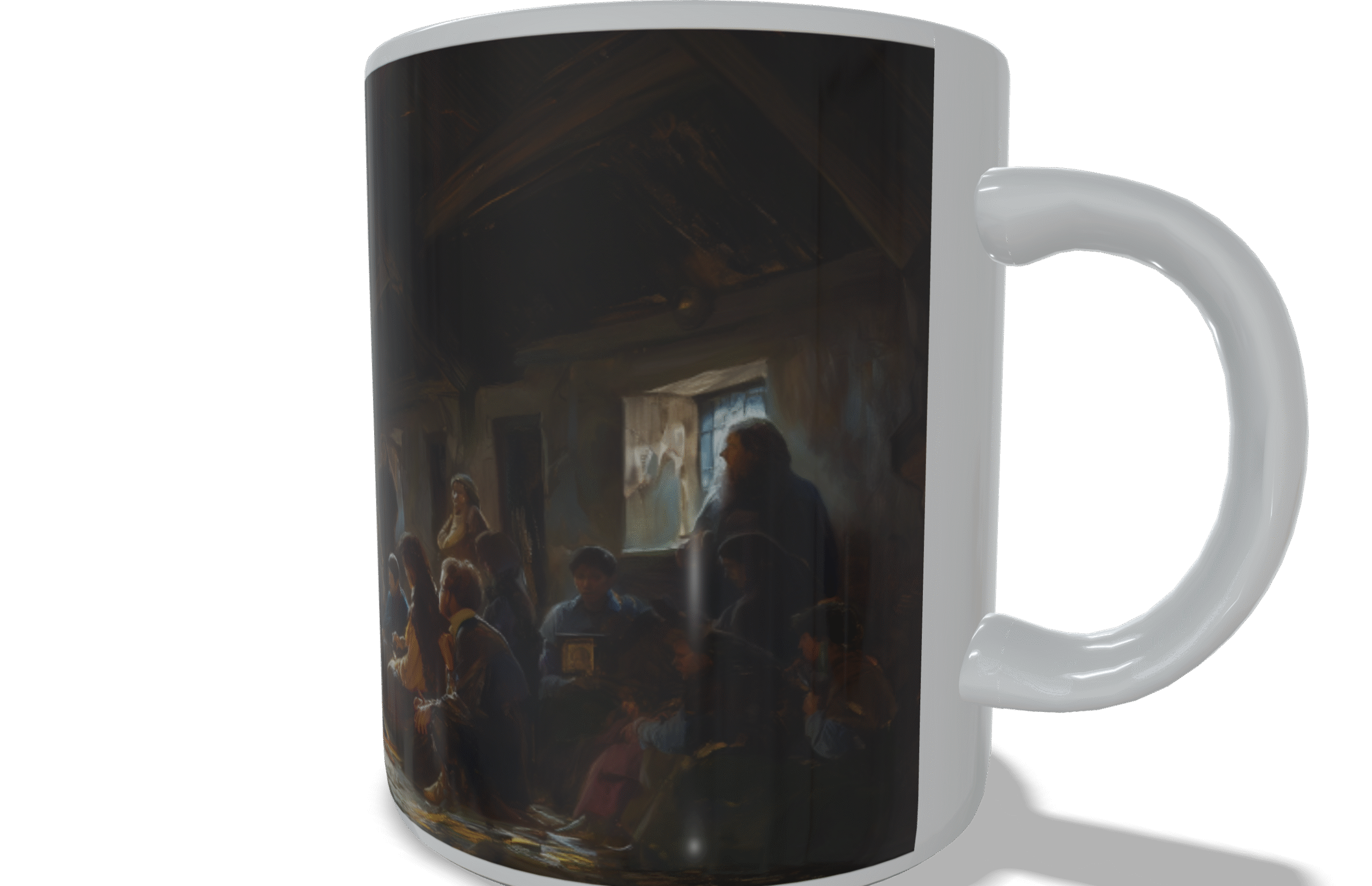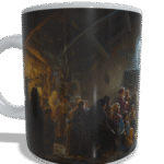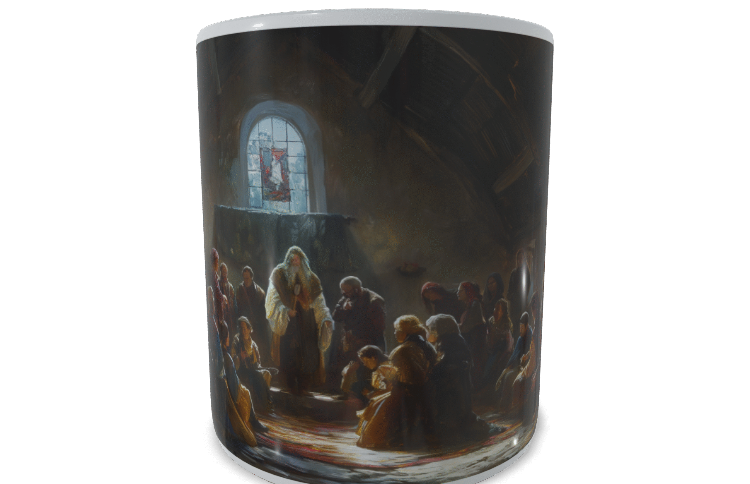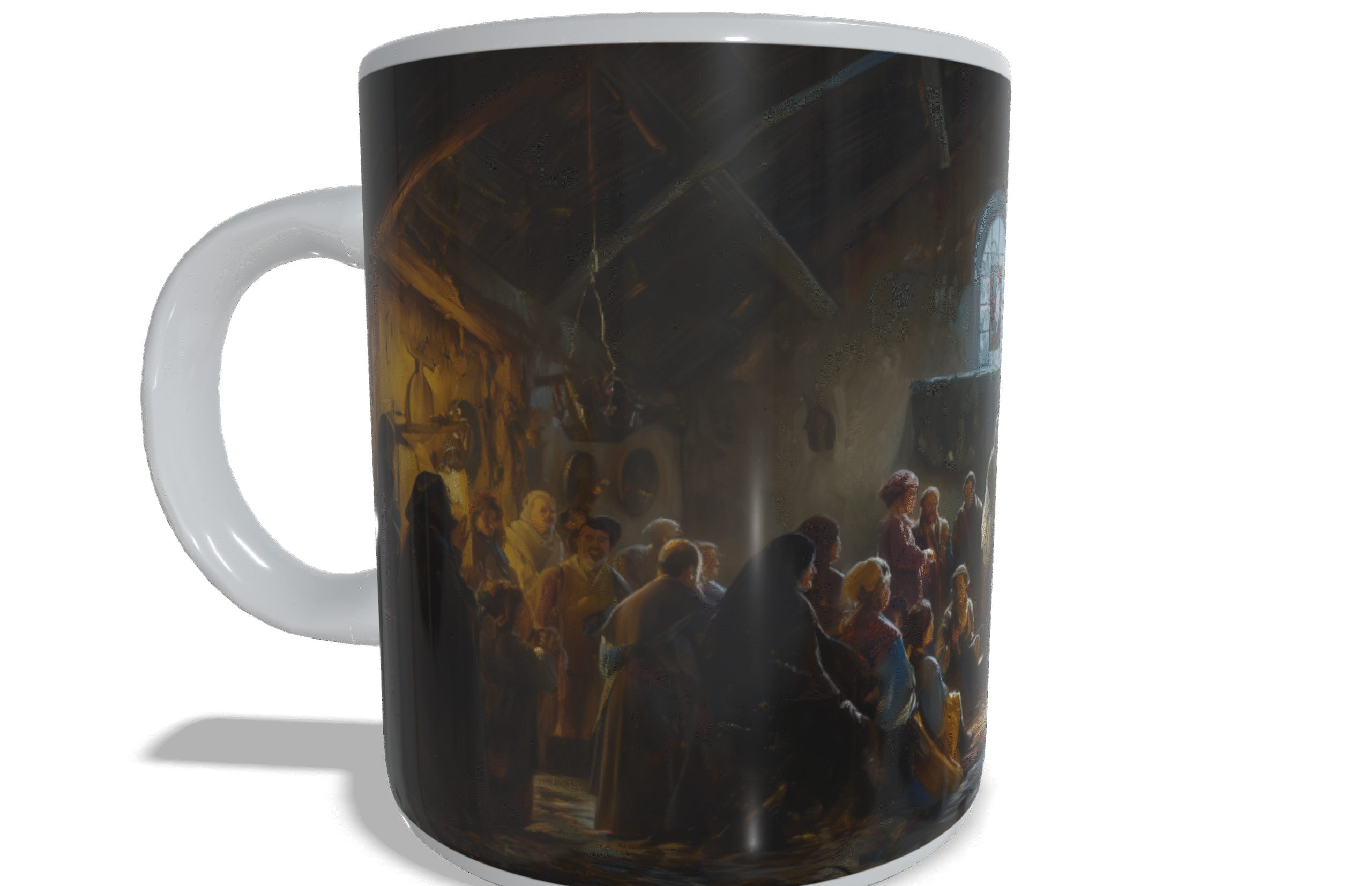 Kubek „Ciemno wszędzie, głucho wszędzie, co to będzie, co to będzie” wyróżnia się swoim klimatycznym i tajemniczym designem. Rysunek na kubku przedstawia scenę obrzędu Dziadów w kaplicy, co dodaje mu wyjątkowej atmosfery i głębi. Obrzęd Dziadów, będący częścią polskiej tradycji, symbolizuje kontakt ze światem duchów, tajemnicę życia po śmierci i znaczenie pamięci o zmarłych. Napis na kubku wprowadza element napięcia i tajemnicy, przypominając o mrocznych aspektach ludzkiej egzystencji.