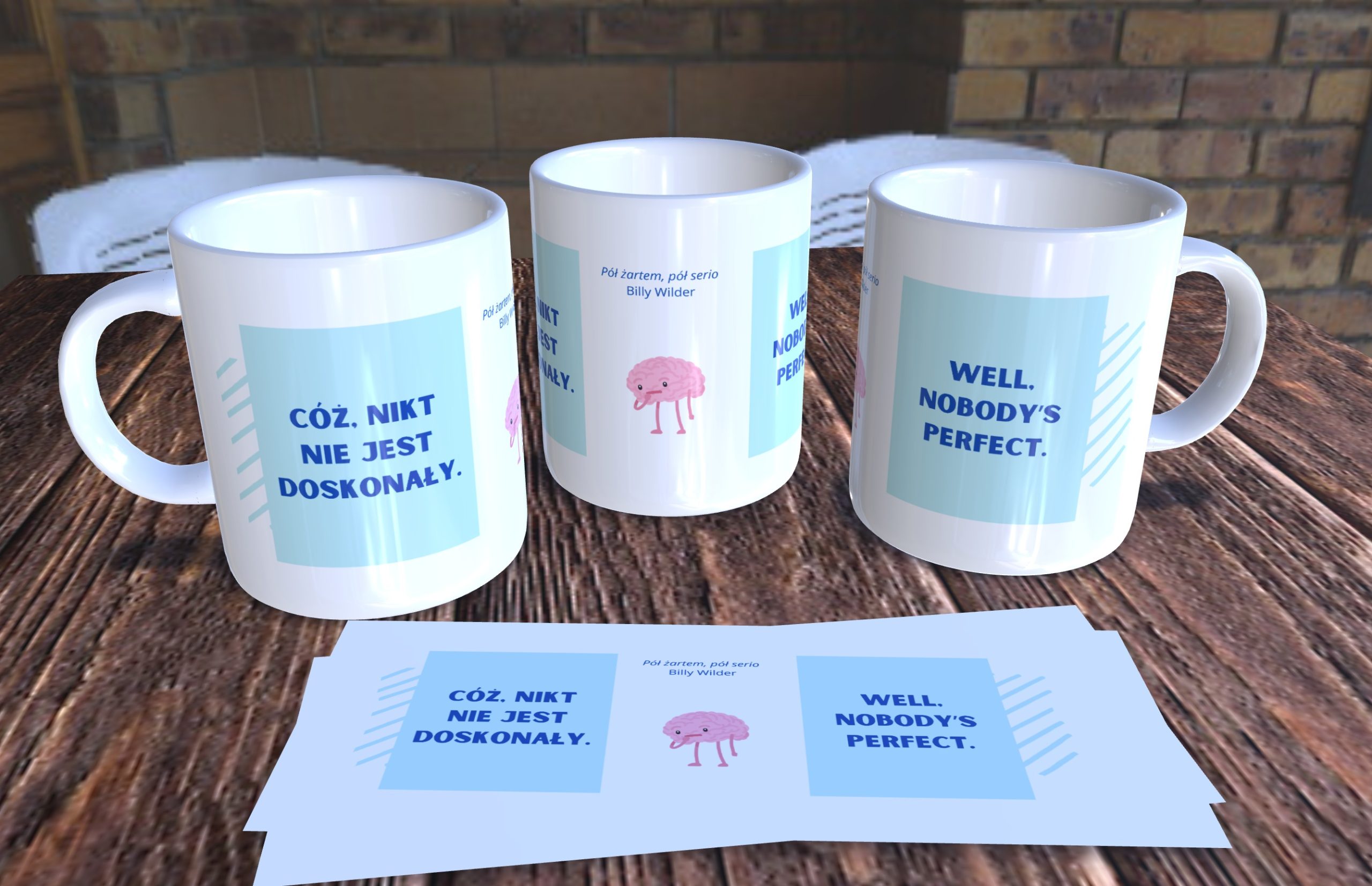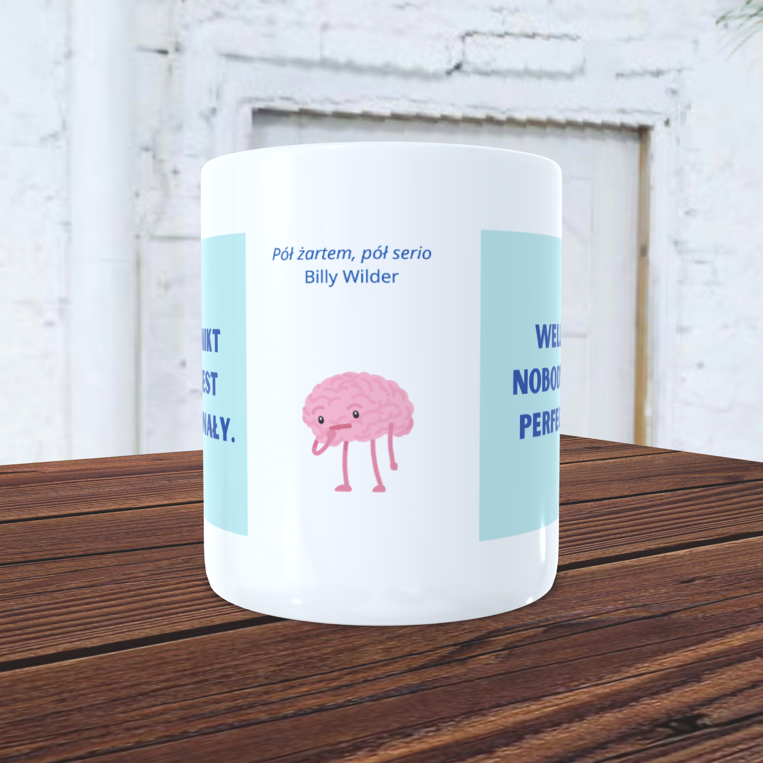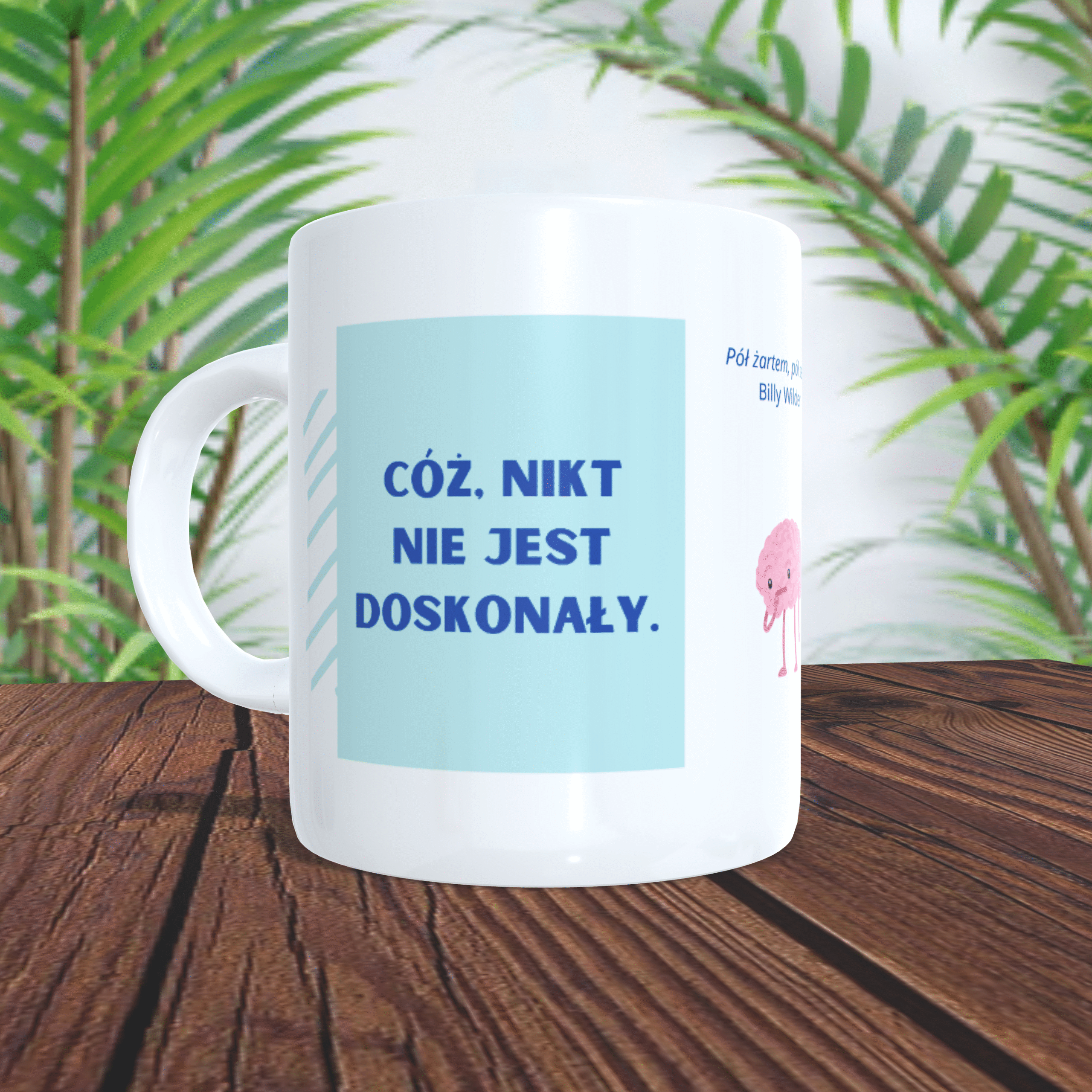 Kubek „Cóż, Nikt Nie Jest Doskonały” to doskonały sposób na rozpoczęcie dnia z uśmiechem. Grafika na kubku jest wyjątkowo zabawna i pełna uroku, zawierając cytat w dwóch językach: „Cóż, nikt nie jest doskonały.” po polsku oraz „Well, nobody’s perfect.” po angielsku. Dodatkowo, śmieszny rysunek mózgu dodaje kubkowi jeszcze więcej charakteru. Cytat pochodzi z filmu Billy’ego Wildera „Pół żartem, pół serio”, co sprawia, że kubek ten jest idealnym prezentem dla fanów kina i miłośników dobrej komedii.