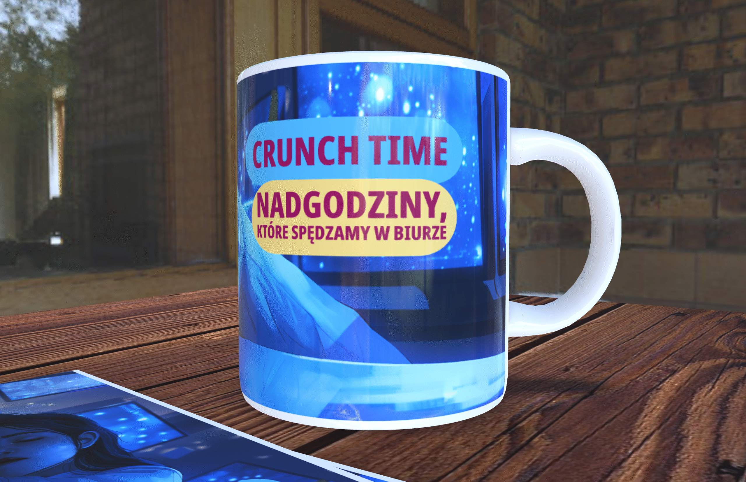 Na kubku widnieje napis, który definiuje pojęcie „Crunch Time”: „Crunch time – nadgodziny, które spędzamy w biurze, by zdążyć z projektem na deadline.” Ta definicja nie tylko dodaje elementu edukacyjnego, ale także podkreśla, że nie jesteś sam w swoich zmaganiach z terminami i długimi godzinami pracy.