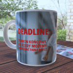 Na kubku umieszczony jest napis, który definiuje pojęcie „Deadline”: „Deadline – termin ostateczny dla projektu” Ta krótka, ale treściwa definicja nie tylko dodaje elementu edukacyjnego, ale także podkreśla uniwersalność doświadczenia związanego z dotrzymywaniem terminów w pracy.