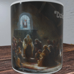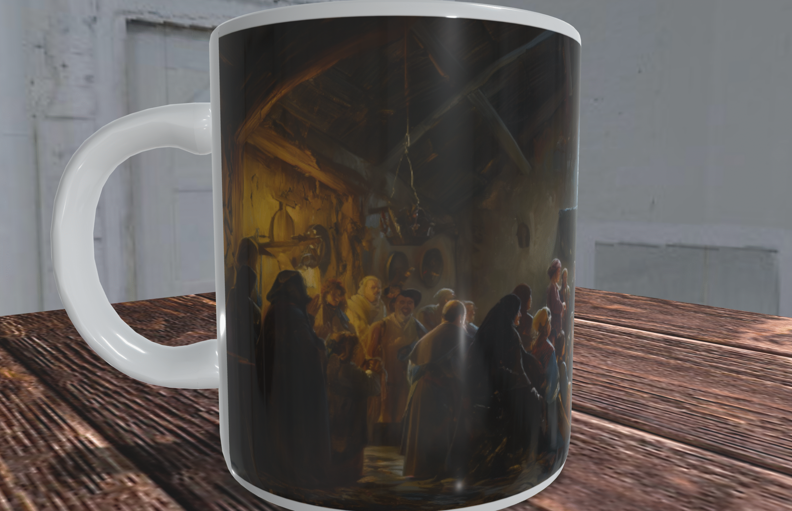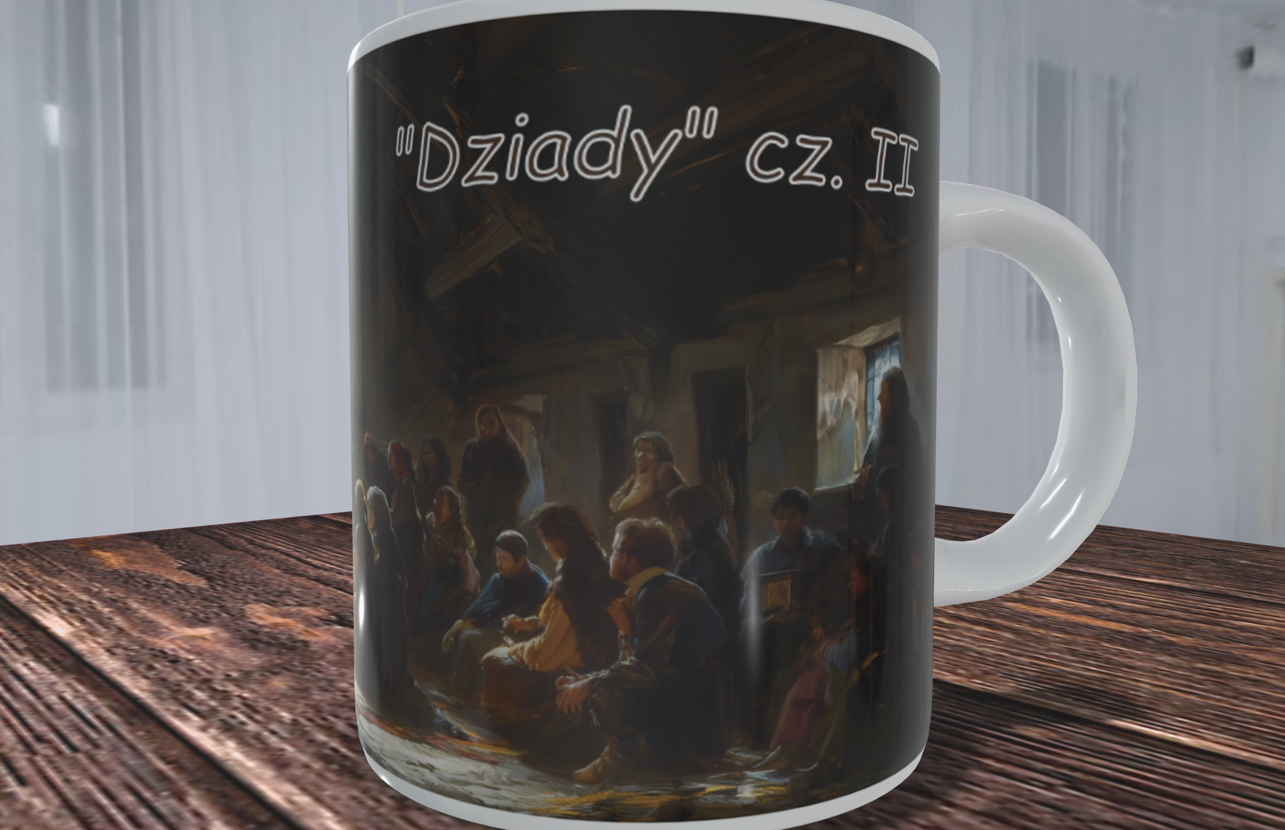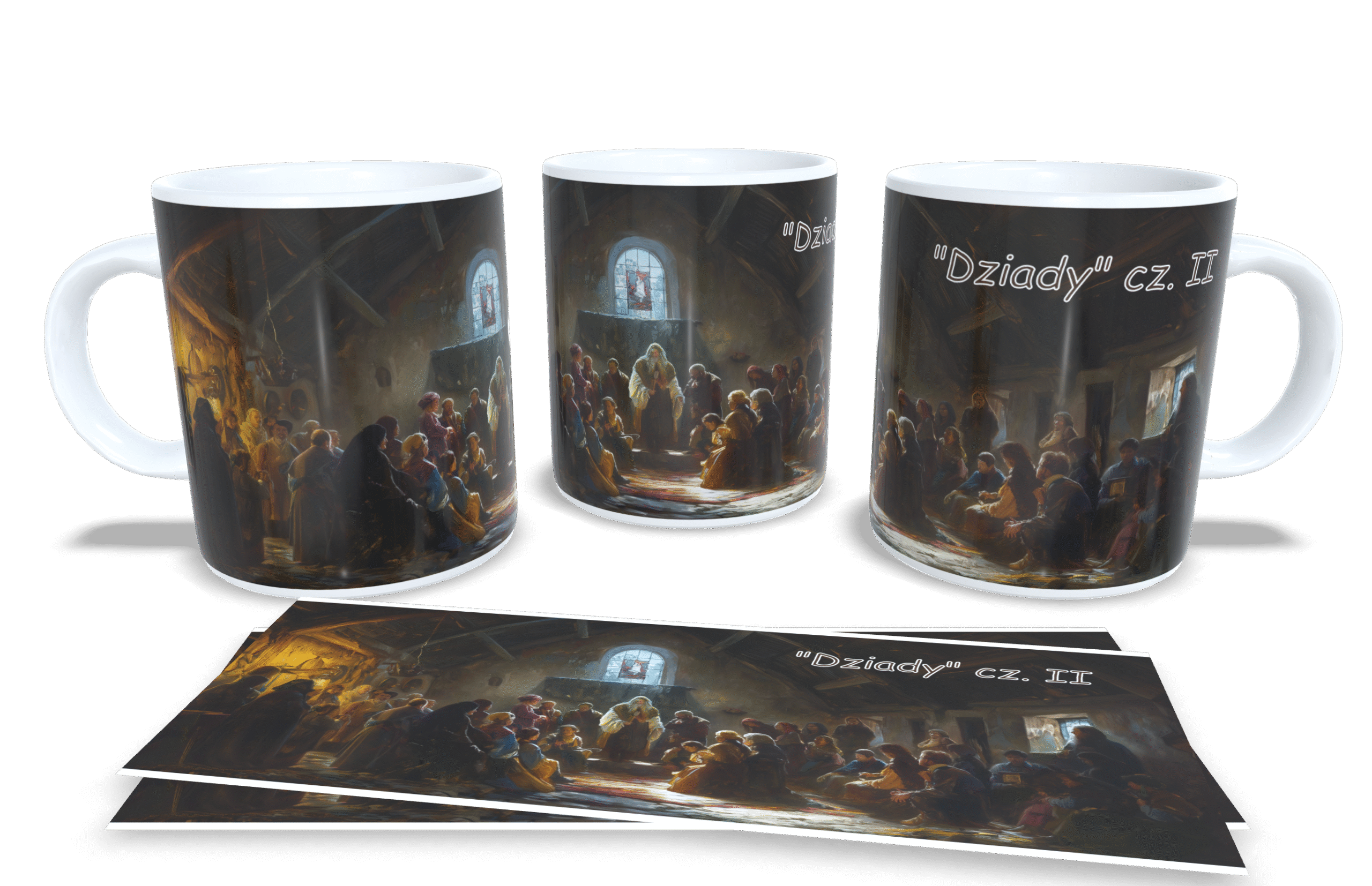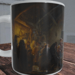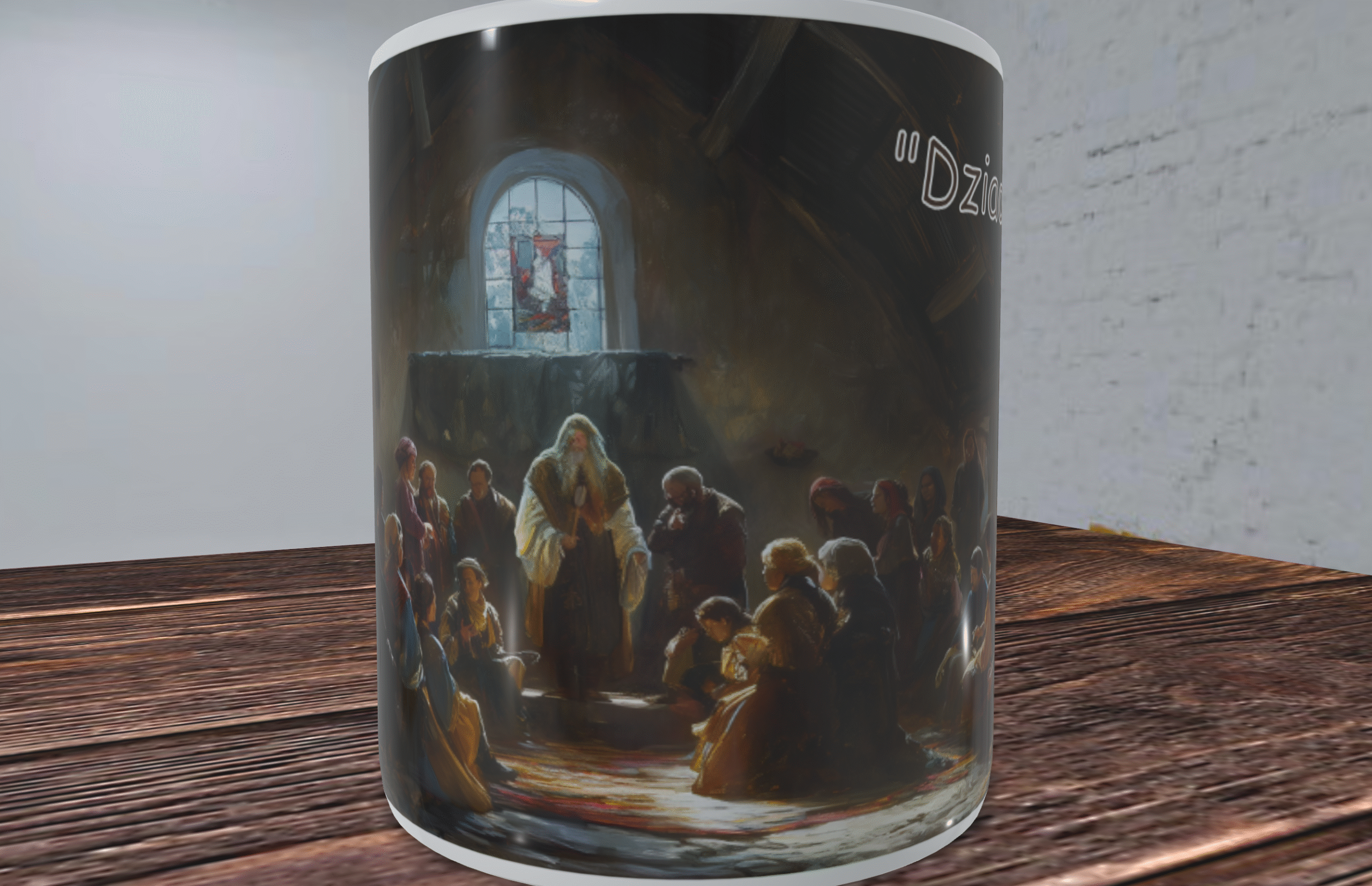 Kubek przedstawia nastrojową scenę, w której zgromadzenie ludzi uczestniczy w tajemniczym rytuale. Wnętrze oświetlone subtelnym światłem, tworzy mistyczną atmosferę, która przyciąga wzrok i skłania do zadumy. Detale ilustracji są niezwykle starannie wykonane, co sprawia, że kubek wygląda jak małe dzieło sztuki. Każdy element sceny jest dopracowany, a całość tworzy harmonijną kompozycję, która zachwyca i inspiruje.