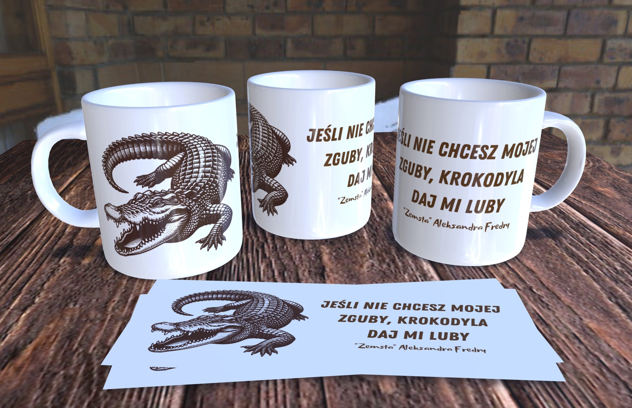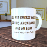 Przedstawiamy unikalny kubek ozdobiony stylową grafiką krokodyla oraz cytatem z „Zemsty” Aleksandra Fredry: „Jeśli nie chcesz mojej zguby, krokodyla daj mi luby”. To idealny prezent dla miłośników literatury, zwierząt oraz osób ceniących sobie wyjątkowe i nietuzinkowe przedmioty codziennego użytku.