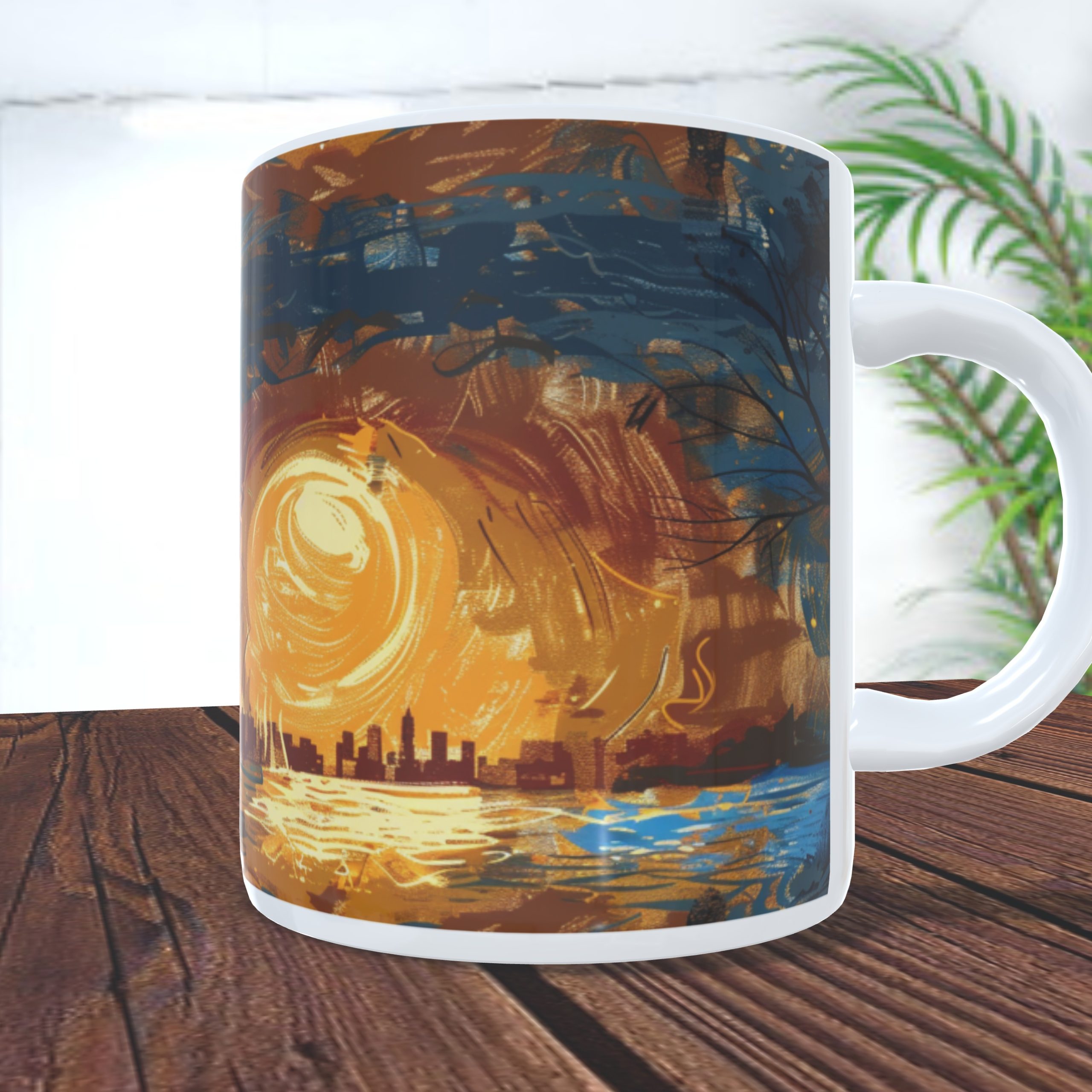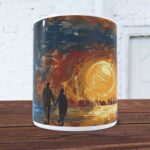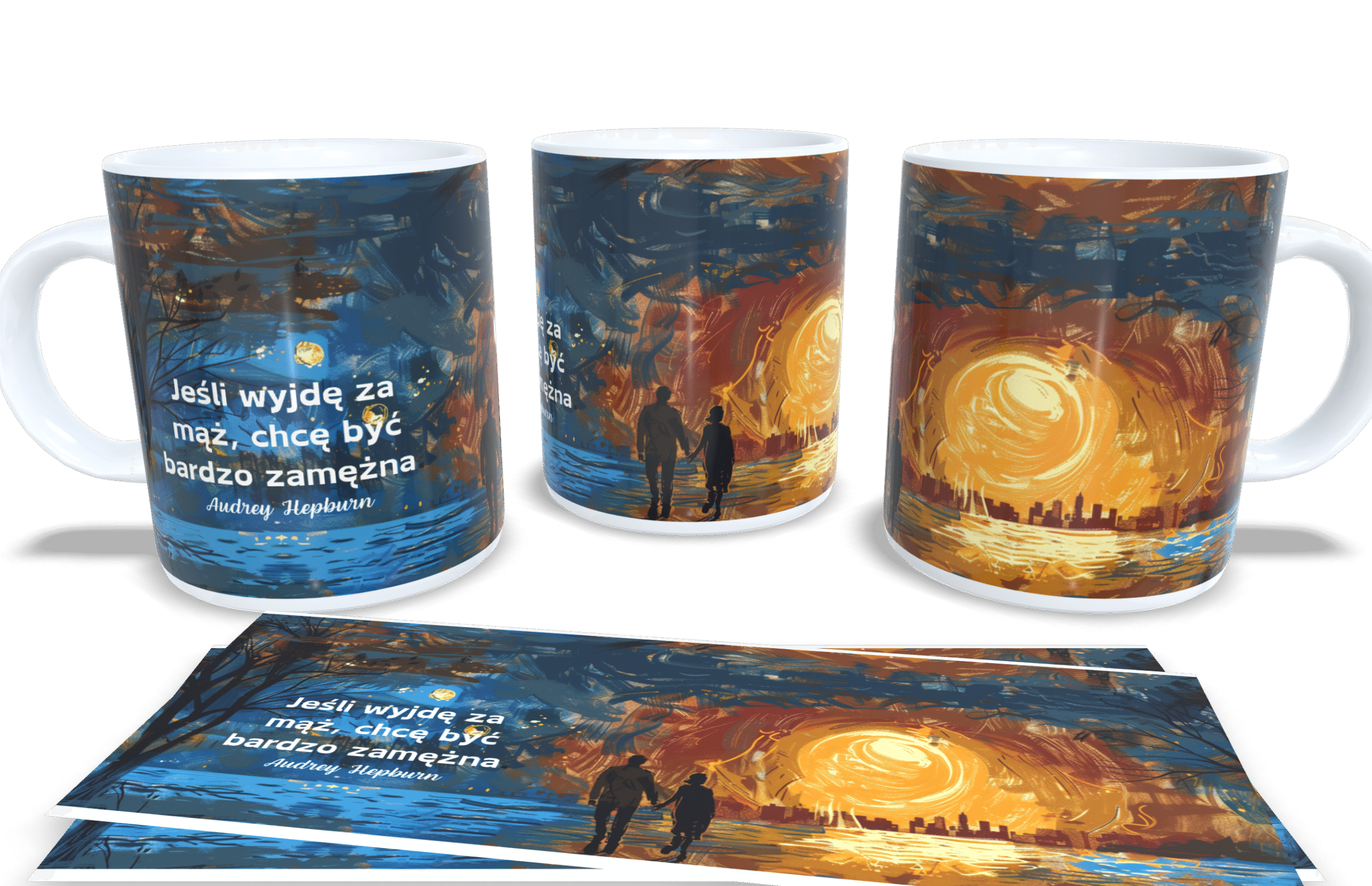 Kubek „Jeśli wyjdę za mąż, chcę być bardzo zamężna” to wyjątkowy produkt, który łączy w sobie elegancję i inspirację. Na kubku znajduje się piękna scena wieczorna, przedstawiająca parę trzymającą się za ręce, spacerującą wzdłuż brzegu. Na tle zachodzącego słońca, które maluje niebo ciepłymi odcieniami pomarańczu i żółci, grafika tworzy nostalgiczny i romantyczny nastrój. Tło pełne intensywnych kolorów doskonale kontrastuje z białym kolorem kubka, podkreślając głębię i detale ilustracji.