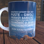 Na kubku widnieje intrygujący cytat z „Katedry”: „Wnętrze Katedry nie jest puste – gwoli prawdy bardziej niż o wnętrzu budynku trzeba tu mówić o jego wnętrznościach”. To zdanie zachęca do głębszej refleksji nad naturą rzeczywistości i złożonością świata przedstawionego w opowiadaniu Dukaja.