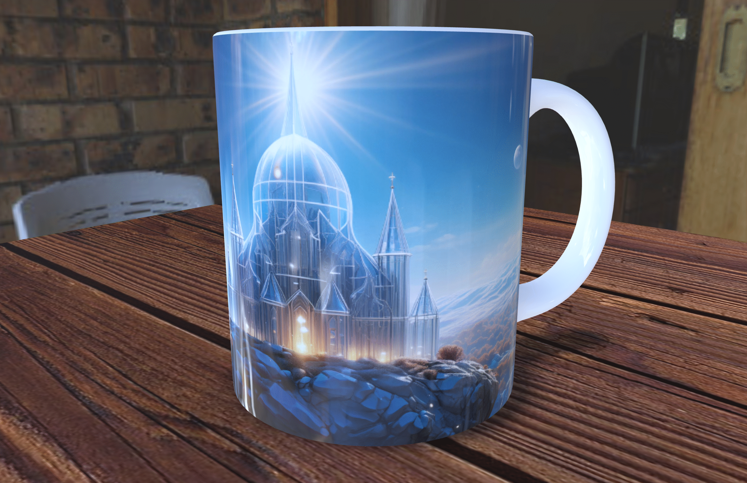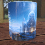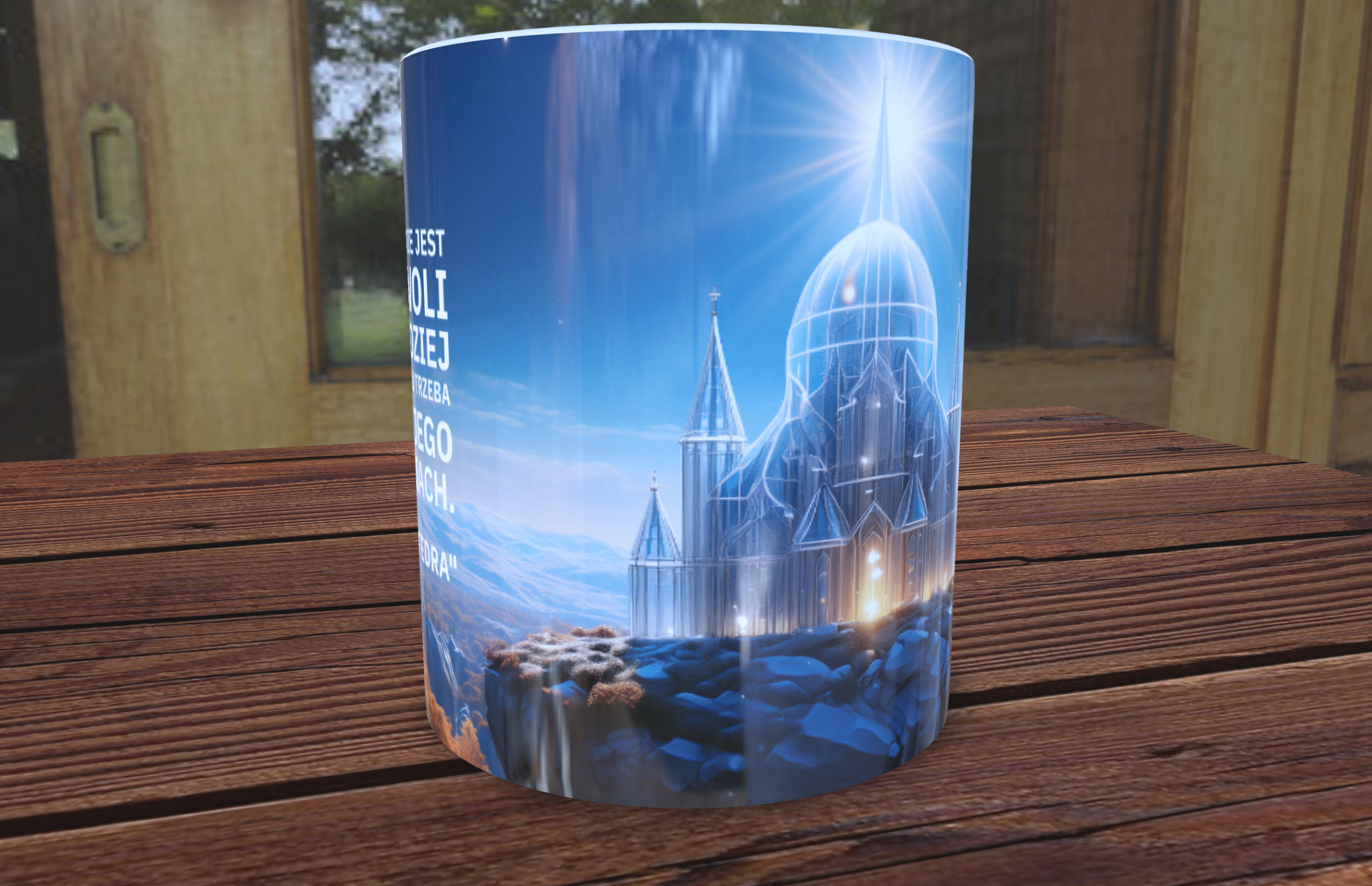Kubek przedstawia majestatyczną wizję katedry stojącej na powierzchni innej planety, skąpanej w świetle obcego słońca. Obok tej surrealistycznej sceny umieszczony jest wspomniany cytat, tworząc harmonijne połączenie obrazu i słowa, które oddaje atmosferę opowiadania Dukaja – pełną tajemnicy i głębi.