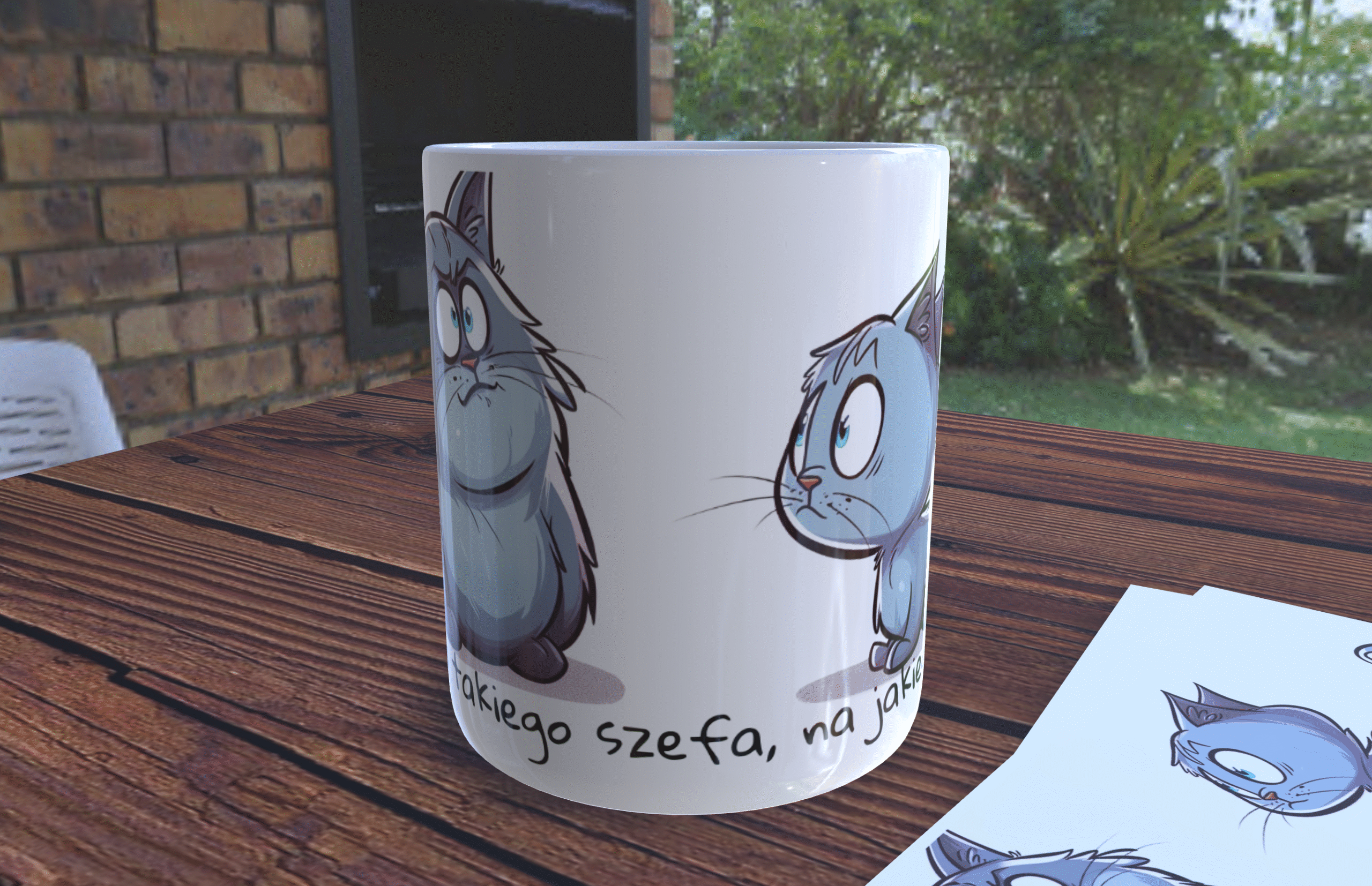 Na powierzchni kubka widnieje zabawna i urocza grafika przedstawiająca dwa koty. Głównym bohaterem jest duży, tłusty kocur, który symbolizuje szefa. Obok niego siedzi mniejszy, nieco pulchny kotek, wpatrujący się z uwagą w swojego większego towarzysza. Ta kompozycja w humorystyczny sposób odzwierciedla typową relację szef-podwładny, wykorzystując przy tym naturalne cechy kotów – ich niezależność, pewność siebie i skłonność do podporządkowywania sobie otoczenia.