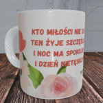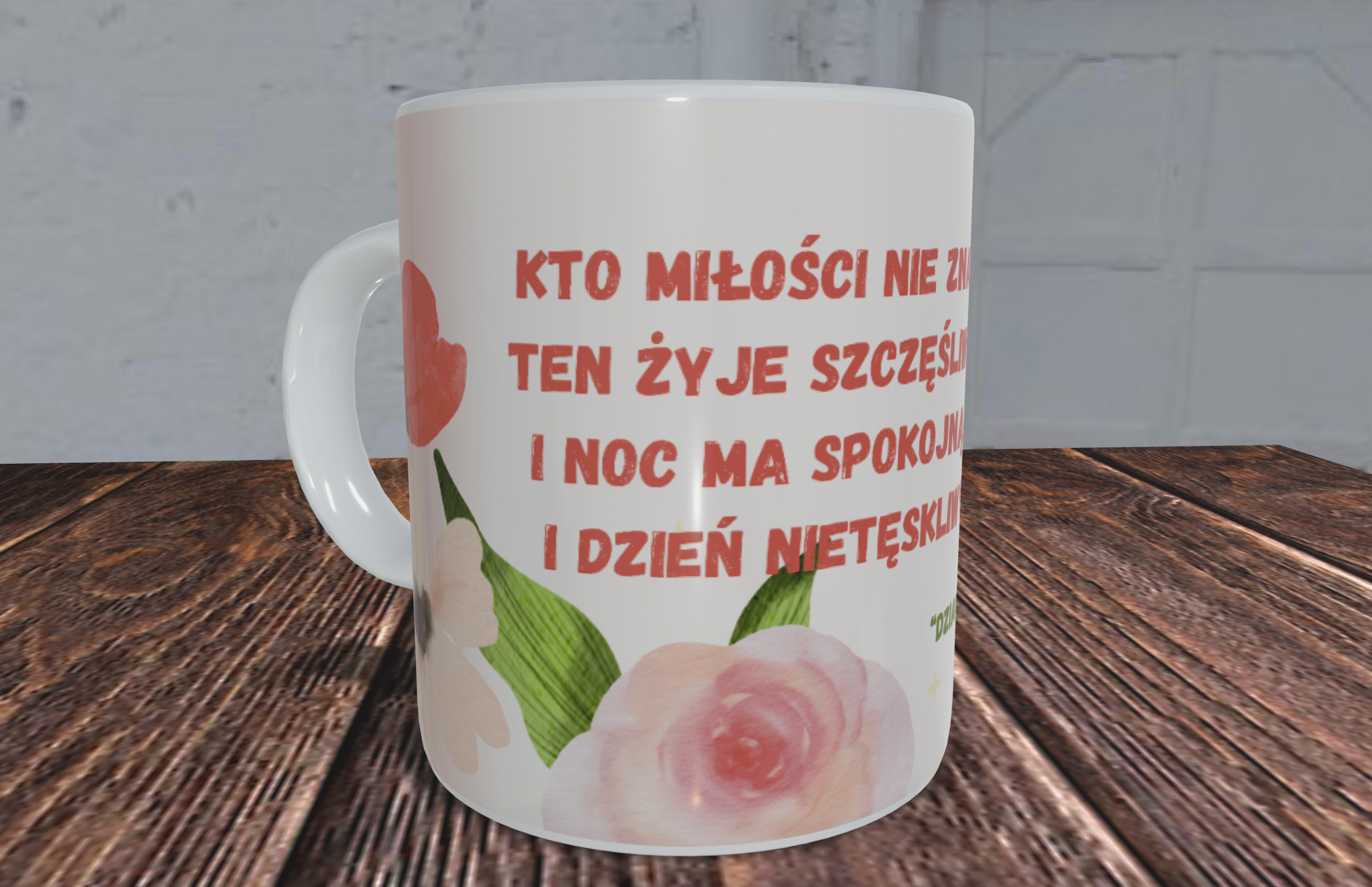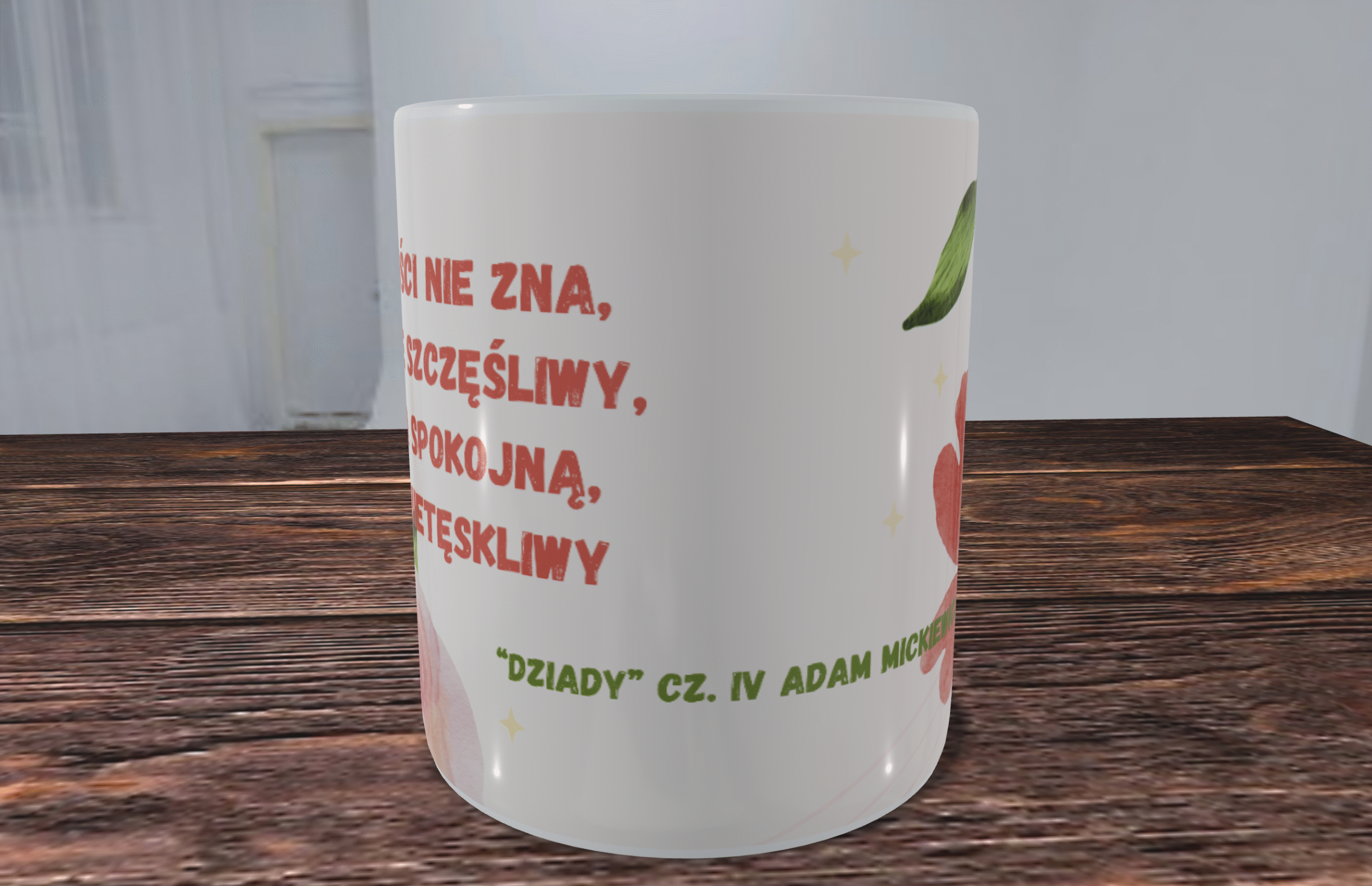 Nasz kubek z cytatem z „Dziadów” Adama Mickiewicza to więcej niż tylko naczynie do picia. To codzienna porcja poezji i refleksji, podana w pięknej, estetycznej formie. Połączenie funkcjonalności z głębokim przesłaniem sprawia, że jest to idealny dodatek do każdej kuchni i biura. Podaruj sobie lub bliskiej osobie ten wyjątkowy kubek i pozwól, aby każde spotkanie z nim było chwilą pełną romantyzmu i poezji.