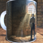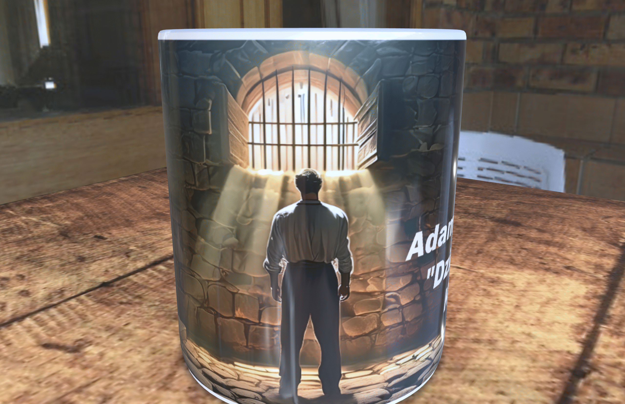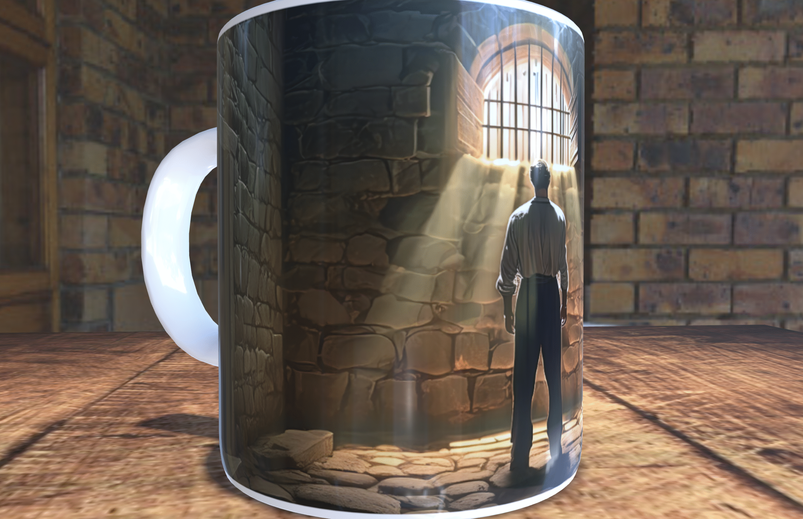 Kubek zdobi grafika przedstawiająca postać stojącą w więziennej celi, do której wpadają promienie słoneczne przez zakratowane okno. Scena ta symbolizuje nadzieję i wewnętrzną siłę, jakie mogą towarzyszyć nawet w najtrudniejszych chwilach. Na tle tej poruszającej ilustracji widnieje cytat: