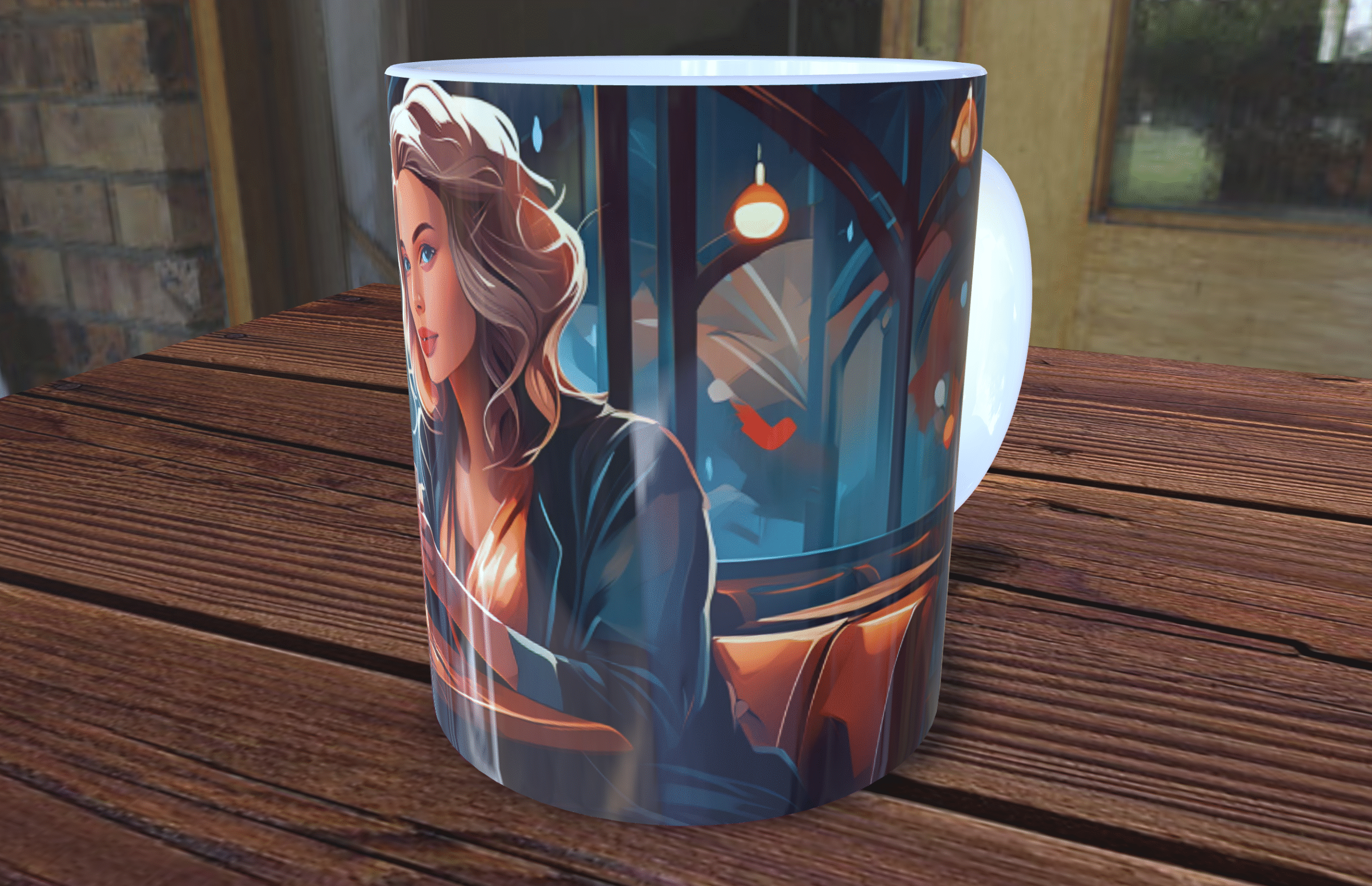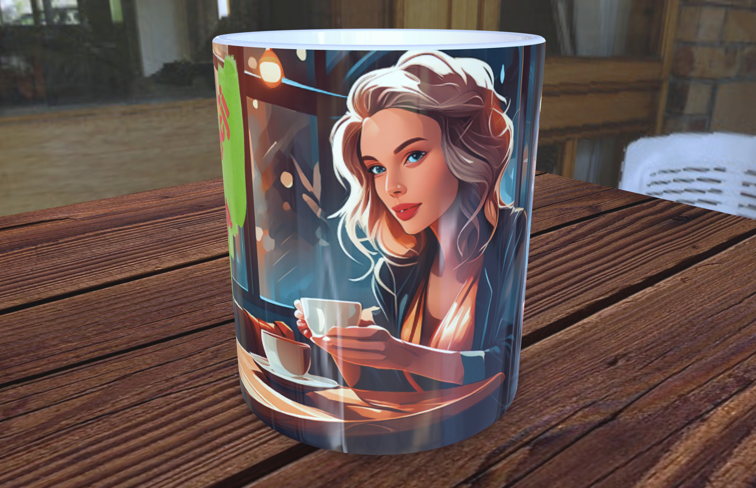 Kubek zdobi urzekająca ilustracja kobiety pijącej kawę w kawiarni. Ten starannie namalowany obrazek przenosi nas w klimat przytulnej kafejki, gdzie można delektować się nie tylko smakiem kawy, ale i atmosferą chwili. Scena ta idealnie uzupełnia napis, tworząc spójną opowieść o miłości do kawy.