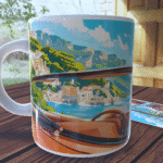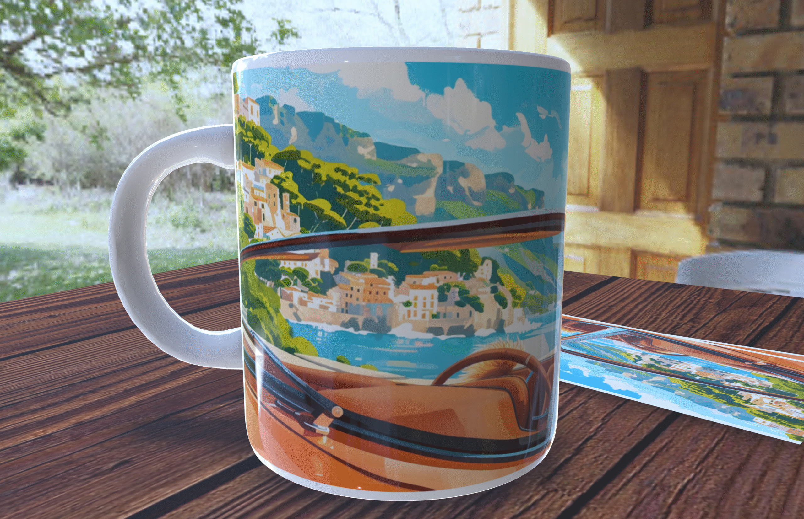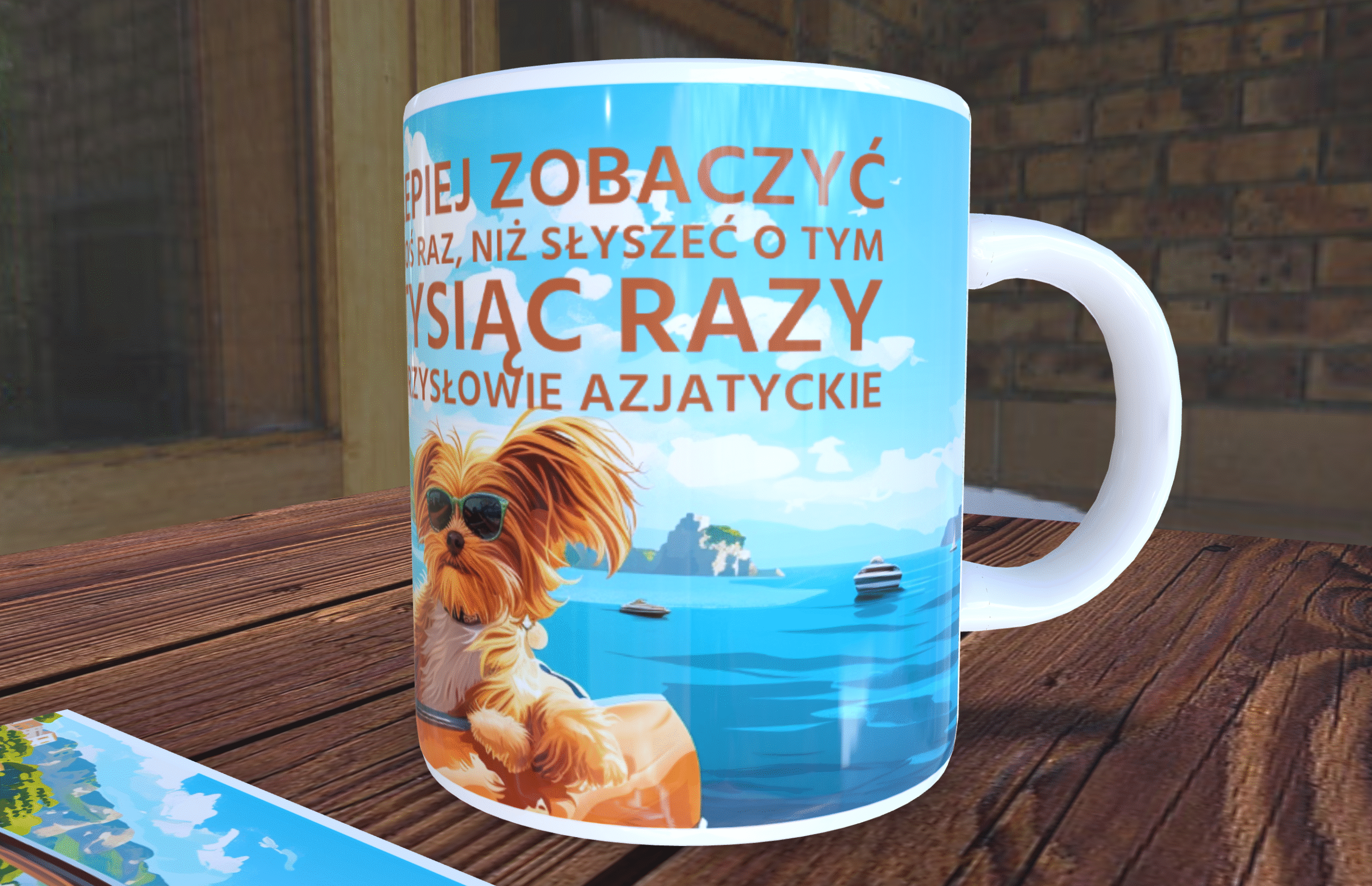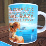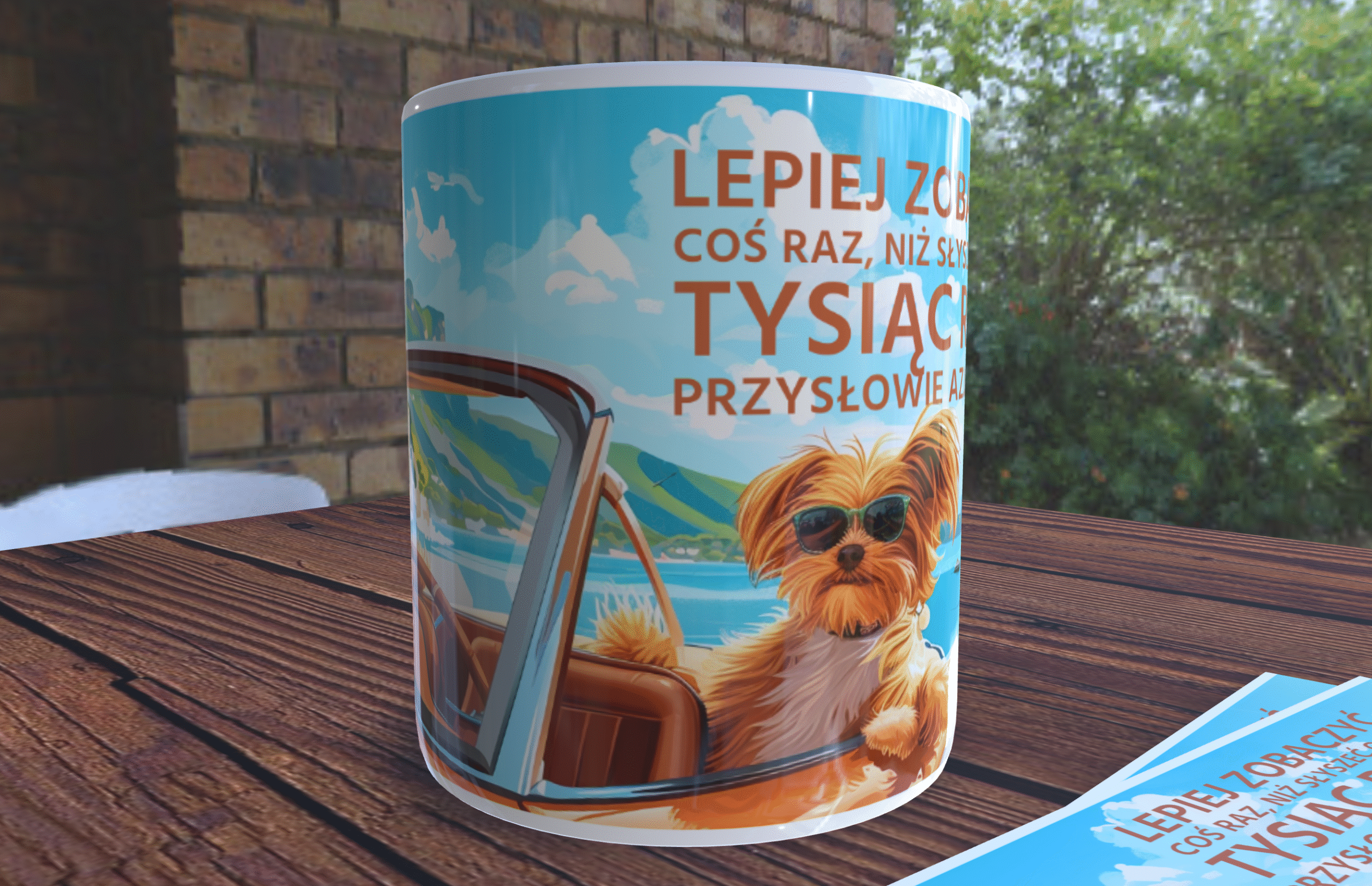 Kubek zdobi czarujący rysunek przedstawiający pieska rasy York w kabriolecie na wybrzeżu włoskim. Ta urocza scena idealnie oddaje ducha beztroskiej przygody i radości z odkrywania nowych miejsc. Detale takie jak powiewająca na wietrze sierść pieska, charakterystyczna architektura włoskiego wybrzeża czy lśniący w słońcu kabriolet tworzą klimatyczny obraz, który przenosi nas prosto na wakacje. Stylistyka rysunku dodaje całości artystycznego charakteru i sprawia, że kubek staje się małym dziełem sztuki.