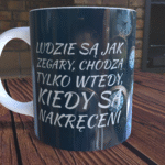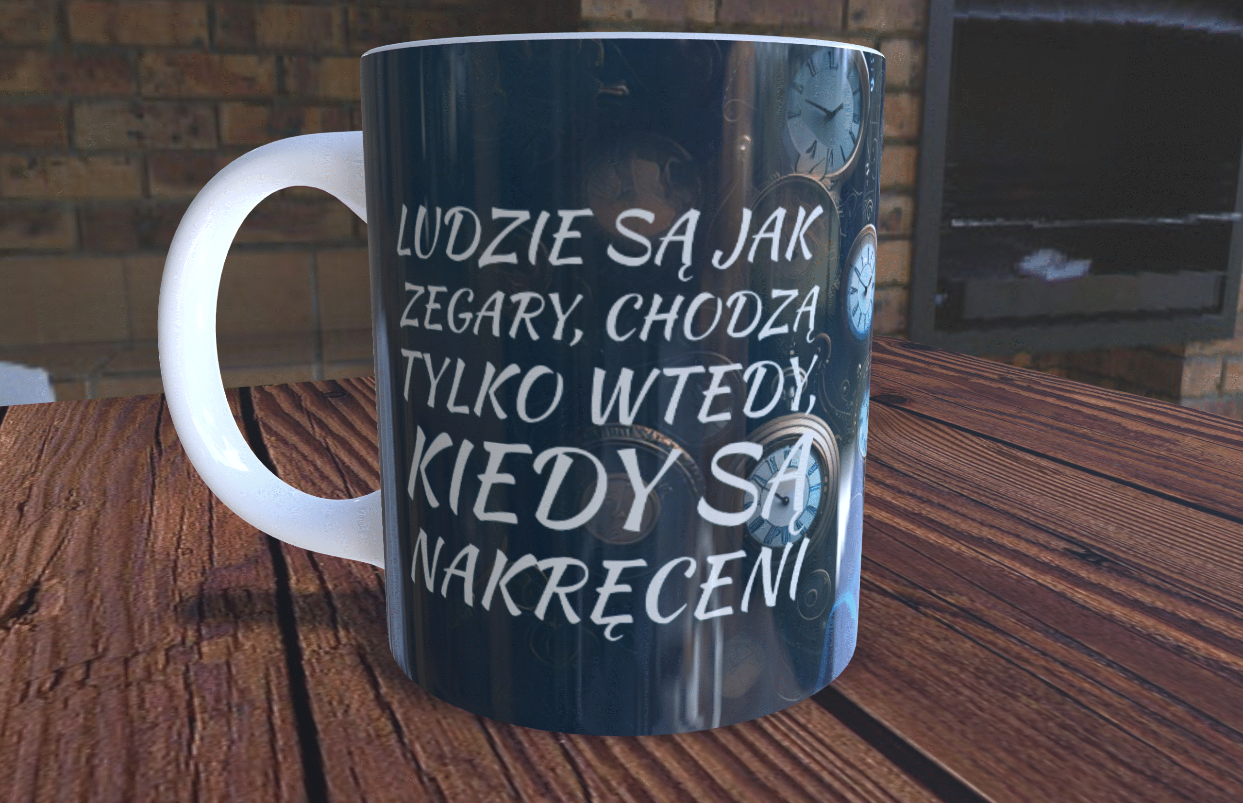 Na kubku widnieje intrygujący cytat: „Ludzie są jak zegary, chodzą tylko wtedy, kiedy są nakręceni”. To głębokie spostrzeżenie, przypisywane Arthurowi Schopenhauerowi, skłania do zastanowienia się nad źródłami ludzkiej energii i motywacji. Każdy łyk z tego kubka stanie się okazją do przemyśleń nad tym, co „nakręca” nas w życiu.
