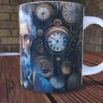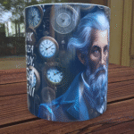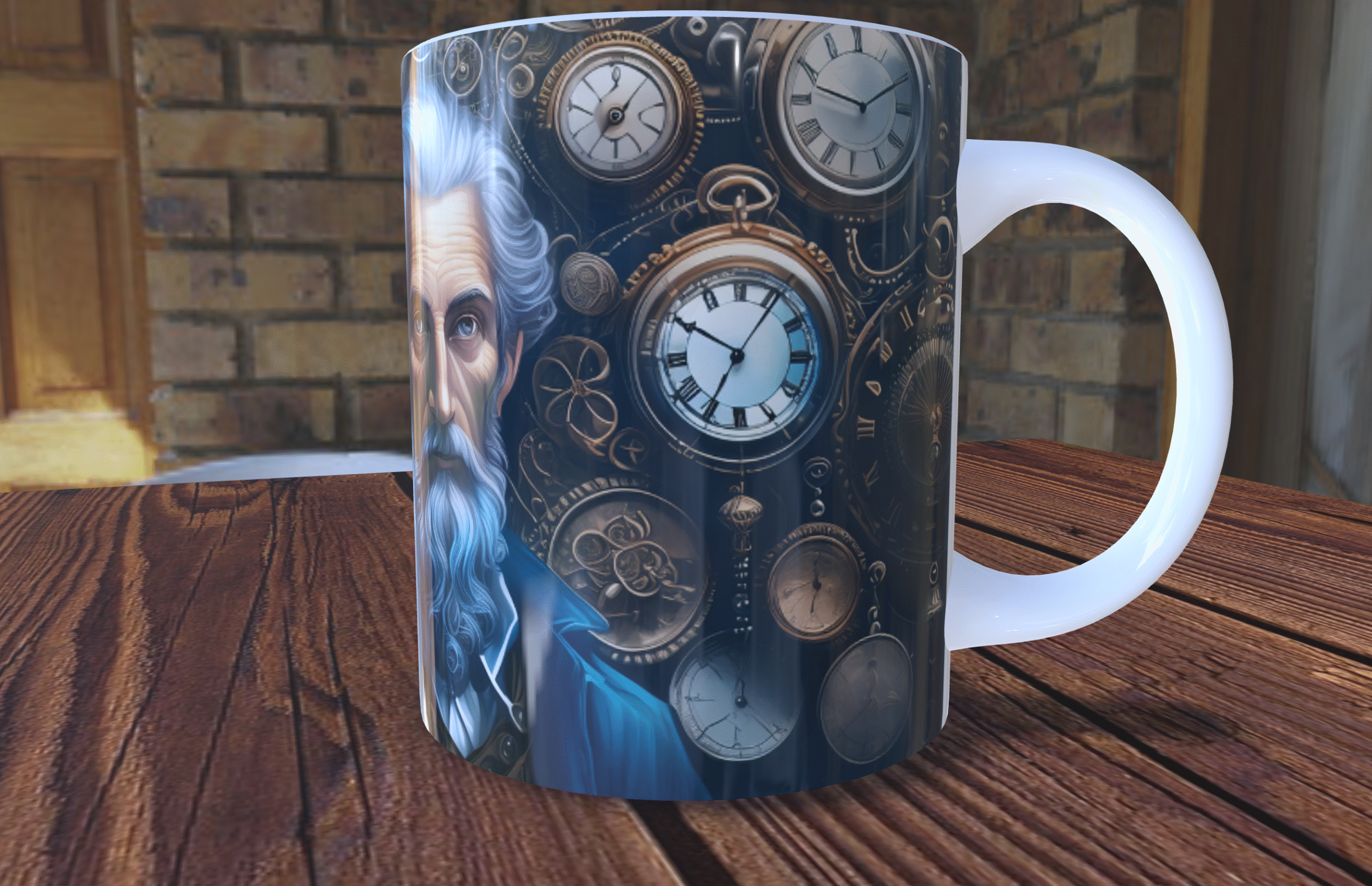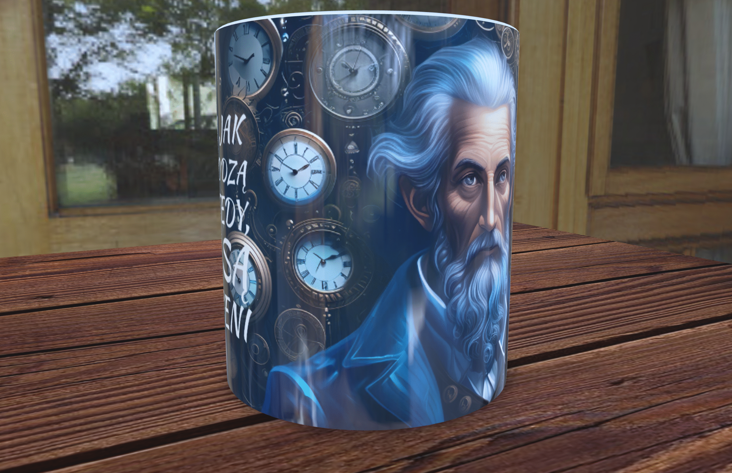 Kubek zdobią starannie wykonane rysunki zegarów, symbolizujące upływ czasu i mechanizmy ludzkiego działania. Centralnym elementem jest portret Arthura Schopenhauera, niemieckiego filozofa znanego z pesymistycznego, ale przenikliwego spojrzenia na naturę ludzką. Ta kompozycja wizualna doskonale uzupełnia filozoficzne przesłanie kubka.