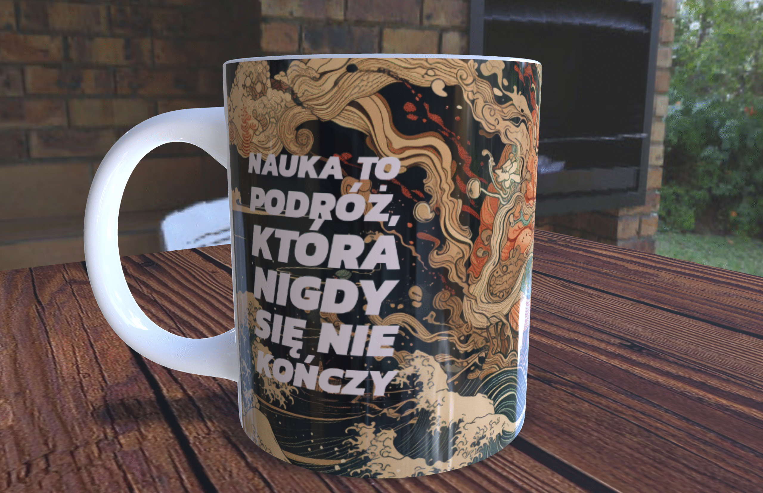 Prezentujemy wyjątkowy kubek, który łączy w sobie fascynację nauką z pięknem tradycyjnej japońskiej sztuki Ukiyo-e. Ten niezwykły przedmiot stanowi most między wschodnią estetyką a zachodnim podejściem do nauki. Centralnym elementem projektu jest inspirujący napis: „Nauka to podróż, która nigdy się nie kończy”, podkreślający nieustanną naturę naukowych poszukiwań.