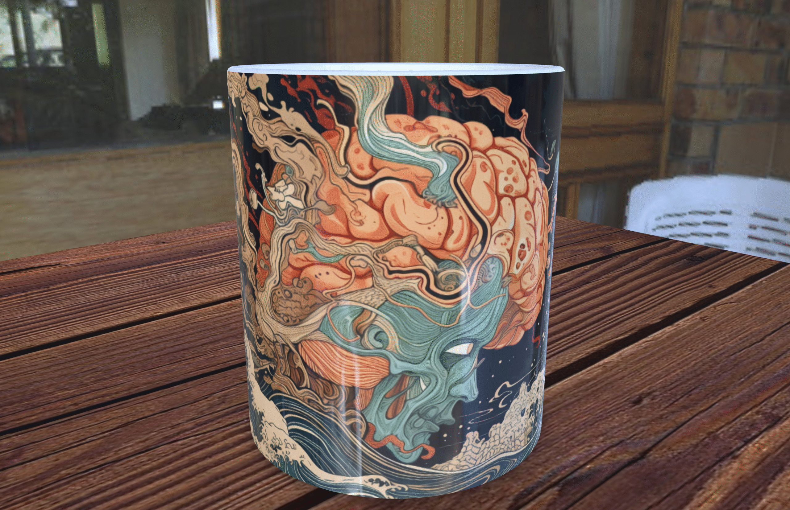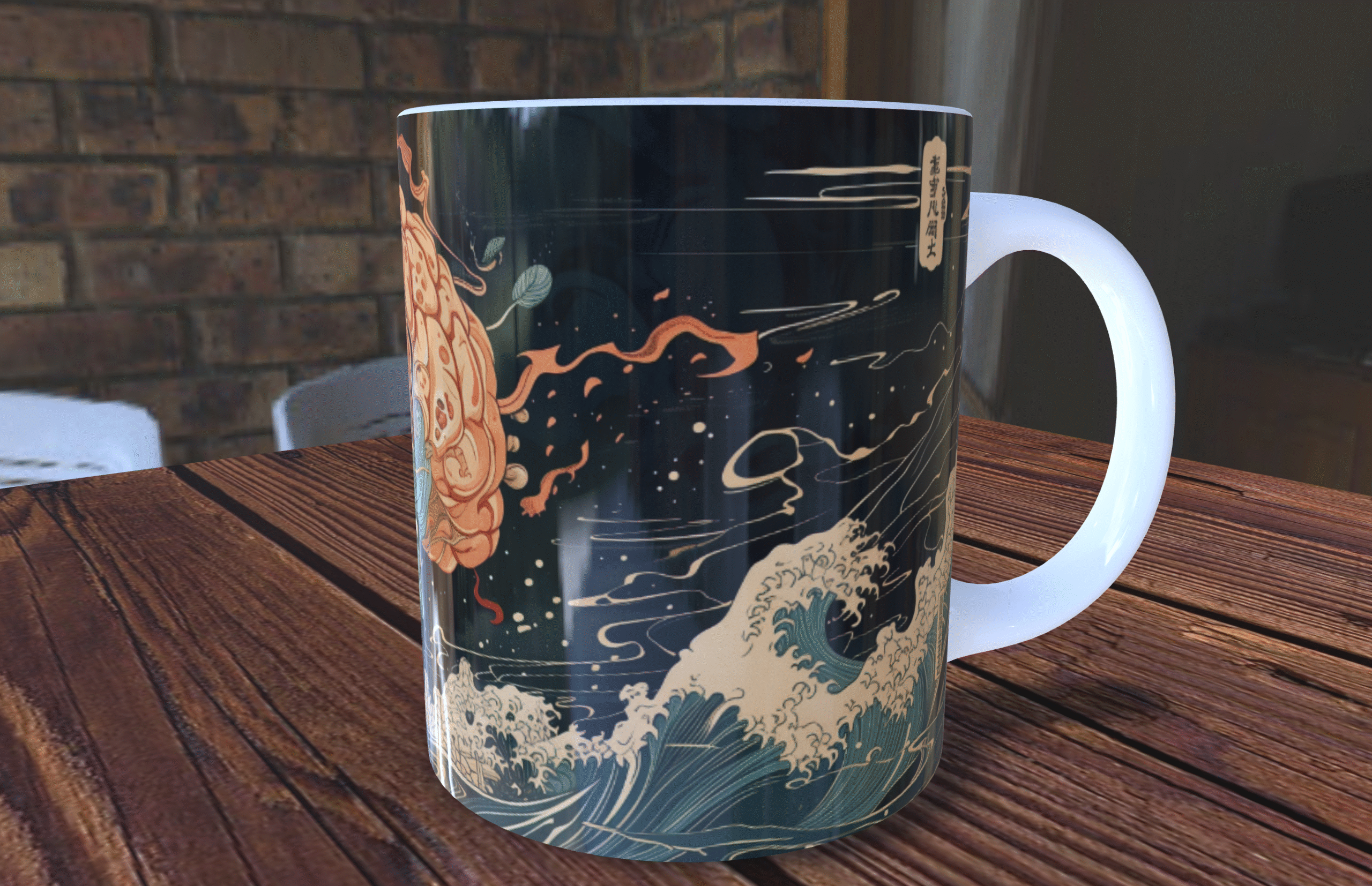 Na powierzchni kubka znajduje się starannie zaprojektowana grafika w stylu Ukiyo-e, przedstawiająca ludzką głowę pędzącą przez fale. Obraz łączy w sobie charakterystyczne elementy japońskiego drzeworytu – wyraziste linie, płaskie plamy koloru i dynamiczną kompozycję – z symboliką naukowej podróży. Fale, przez które przemierza głowa, mogą symbolizować strumień wiedzy, nieustanne wyzwania lub ocean możliwości, jakie otwiera przed nami nauka.