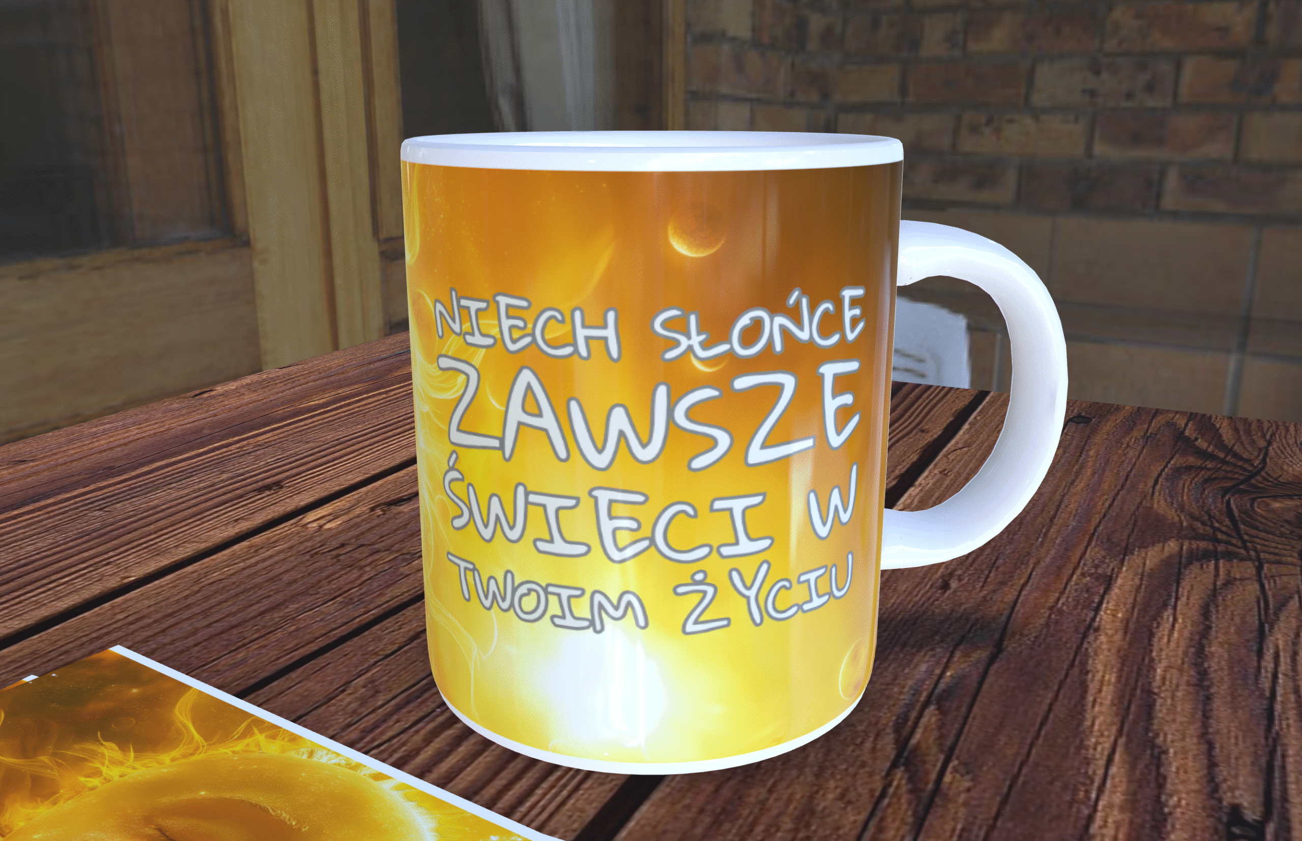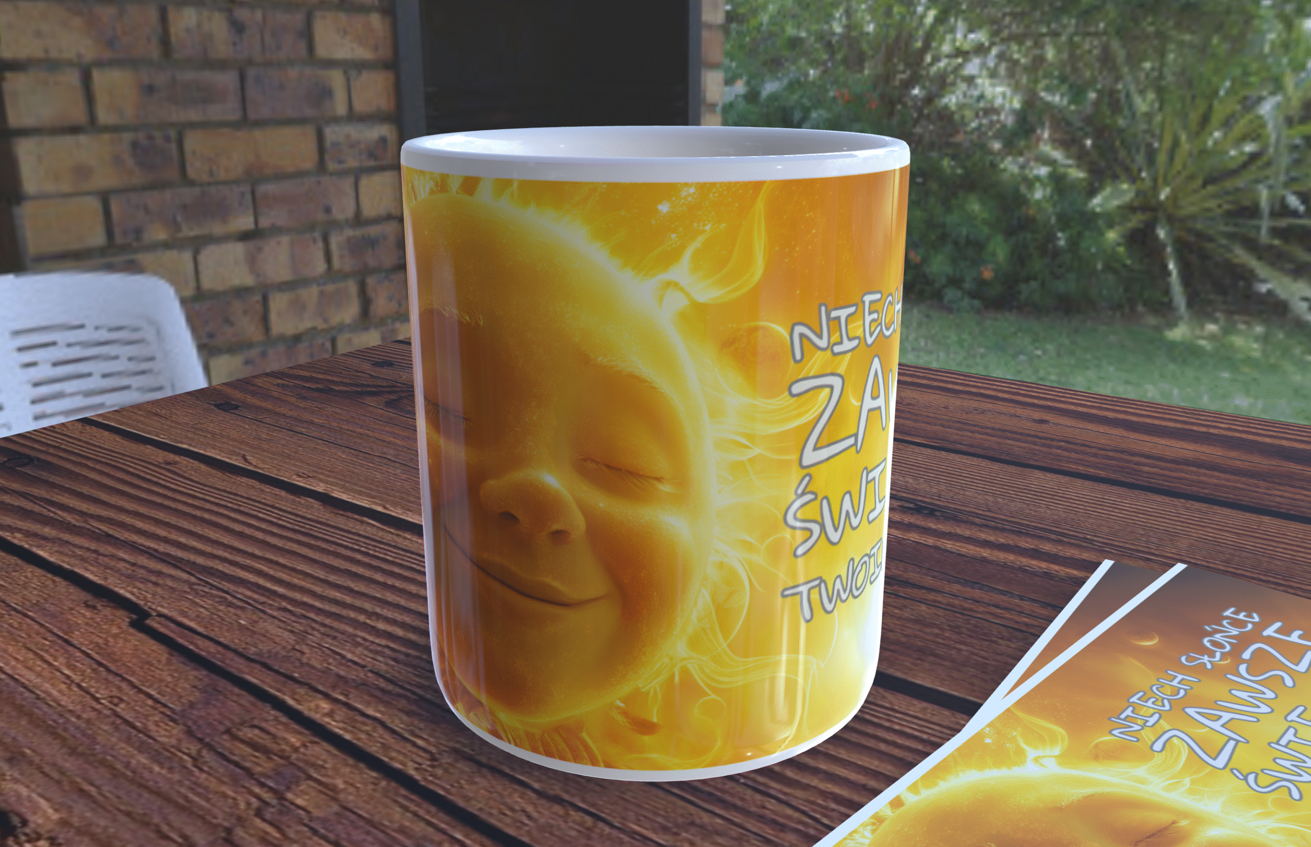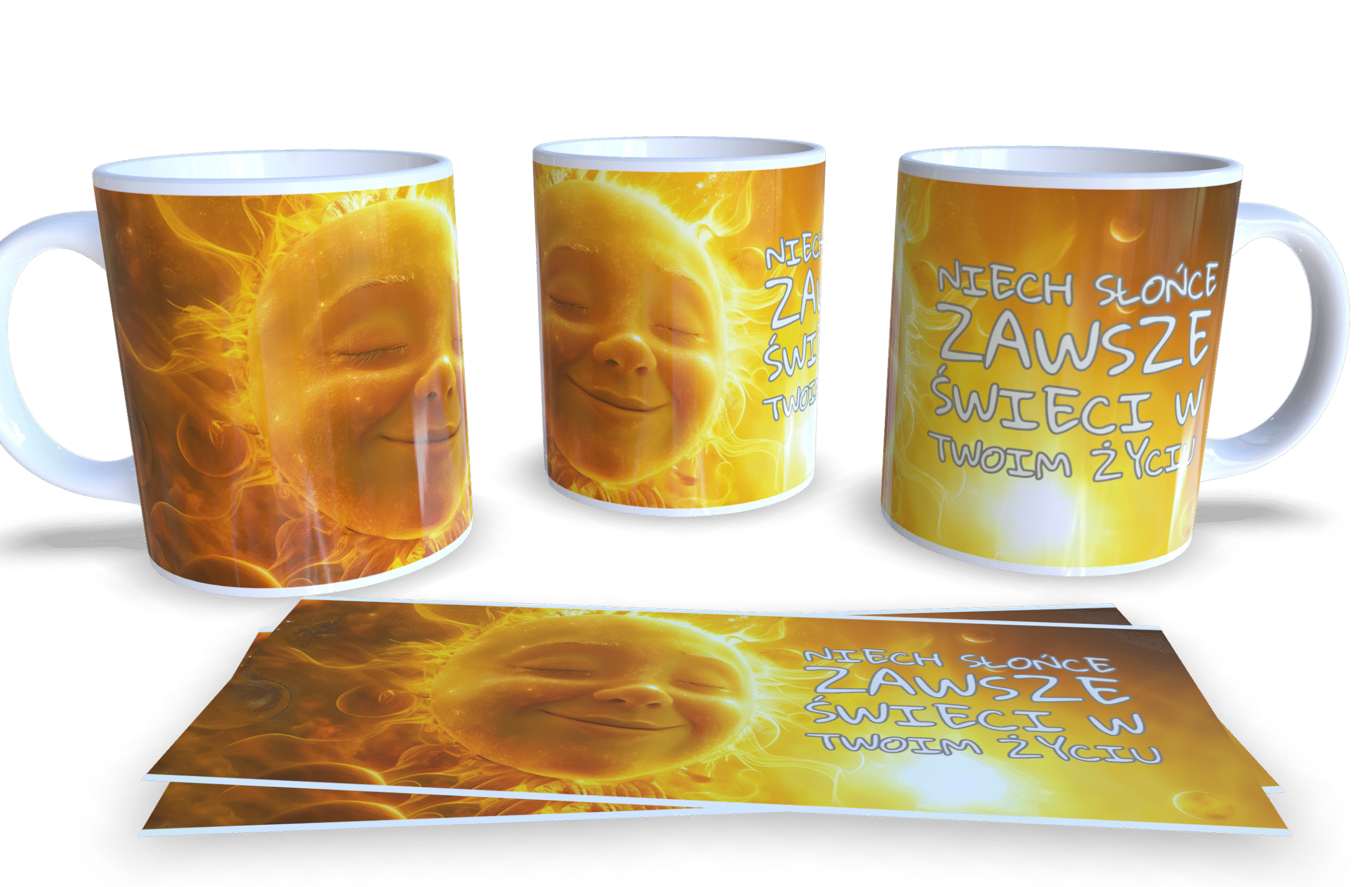 Grafika na kubku jest wykonana metodą sublimacji, co zapewnia niezwykłą trwałość i odporność na blaknięcie. Dzięki tej zaawansowanej technologii, każdy detal uśmiechniętego słońca – od jego wesołych oczu po najdrobniejsze promyki – pozostaje wyraźny i ostry, zachowując żywe i ciepłe kolory przez długi czas użytkowania.