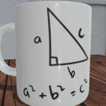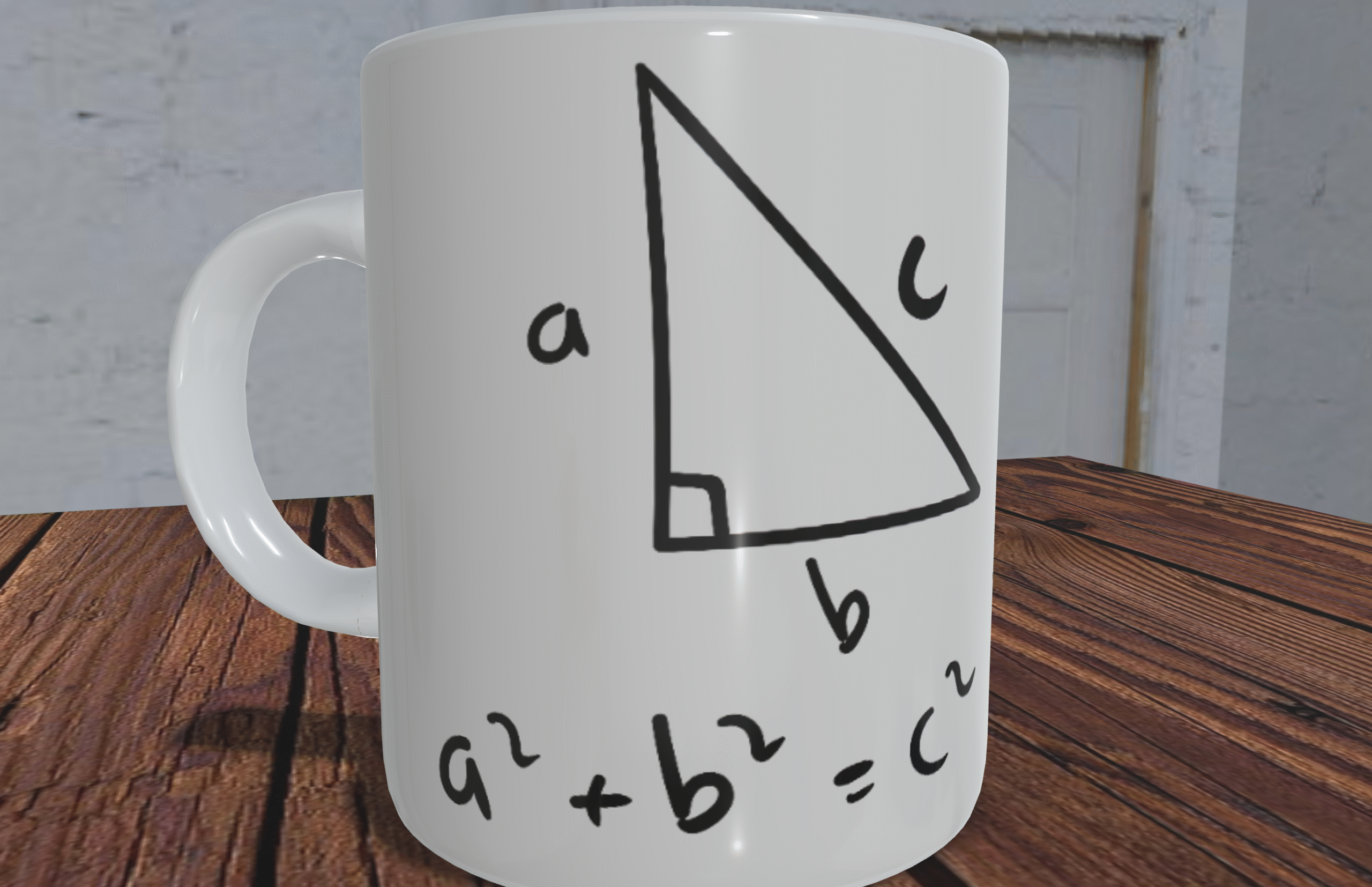 - Rysunek trójkąta prostokątnego – Na kubku widnieje wyraźny i prosty schemat trójkąta prostokątnego z oznaczeniami boków: a, b (przyprostokątne) oraz c (przeciwprostokątna). To doskonała wizualizacja dla każdego, kto chce szybko przypomnieć sobie podstawy geometrii.