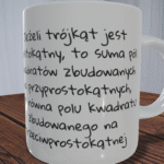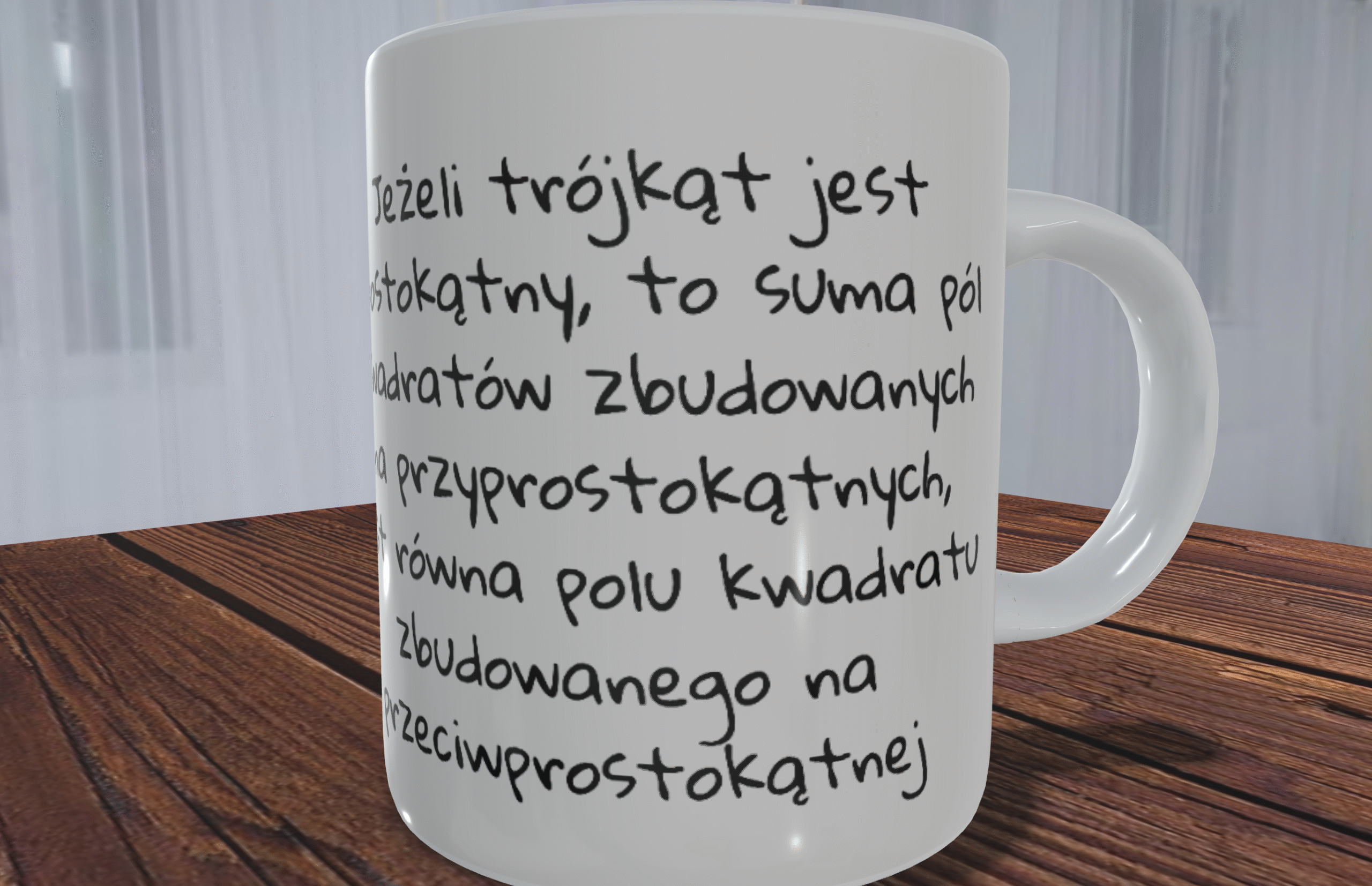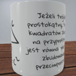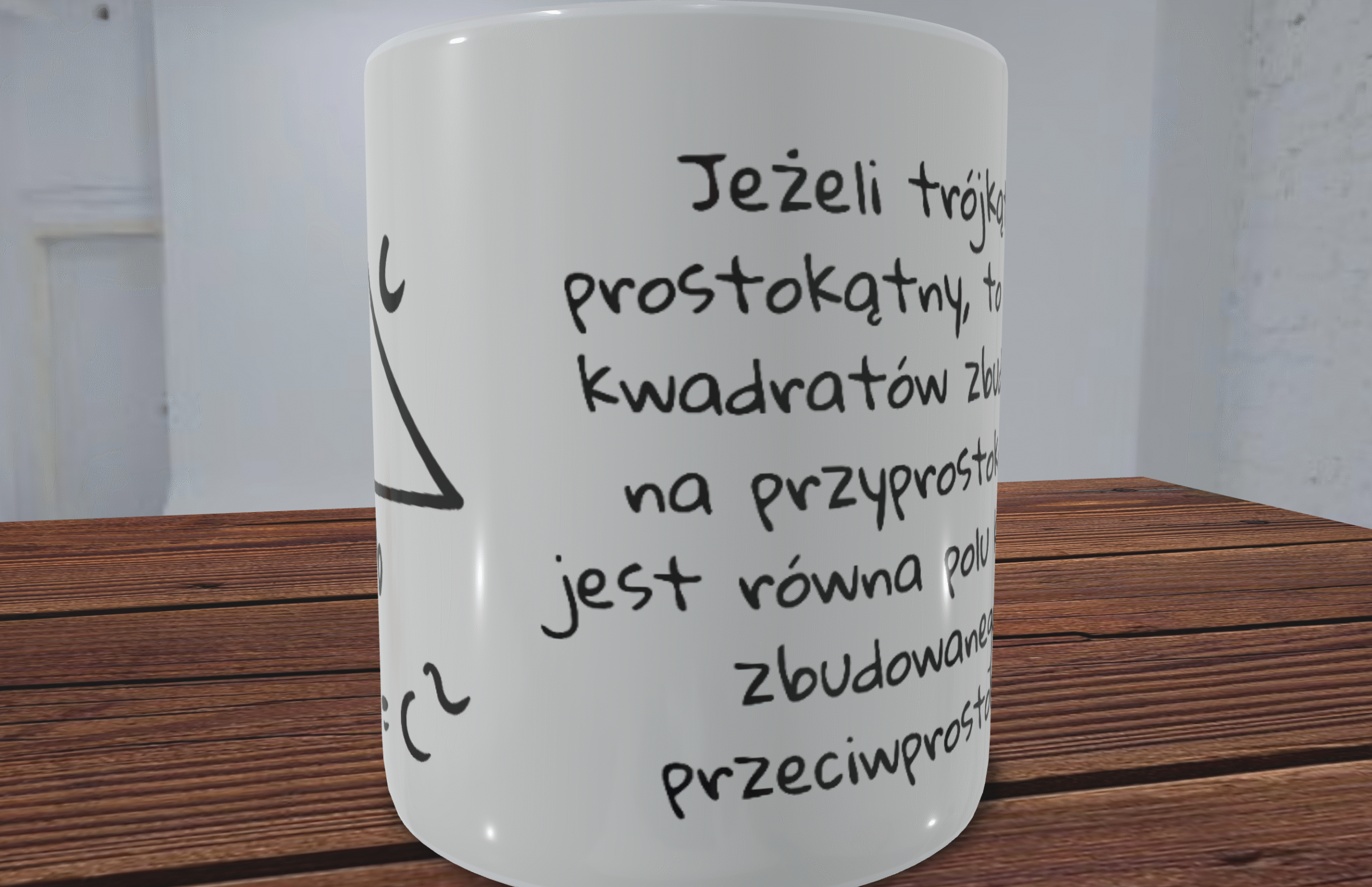 - Tekst wyjaśniający – Z drugiej strony kubka umieszczony jest tekst wyjaśniający twierdzenie Pitagorasa w języku polskim: „Jeżeli trójkąt jest prostokątny, to suma pól kwadratów zbudowanych na przyprostokątnych jest równa polu kwadratu zbudowanego na przeciwprostokątnej.” Jest to doskonałe przypomnienie istoty twierdzenia, które może być użyteczne podczas nauki lub pracy.