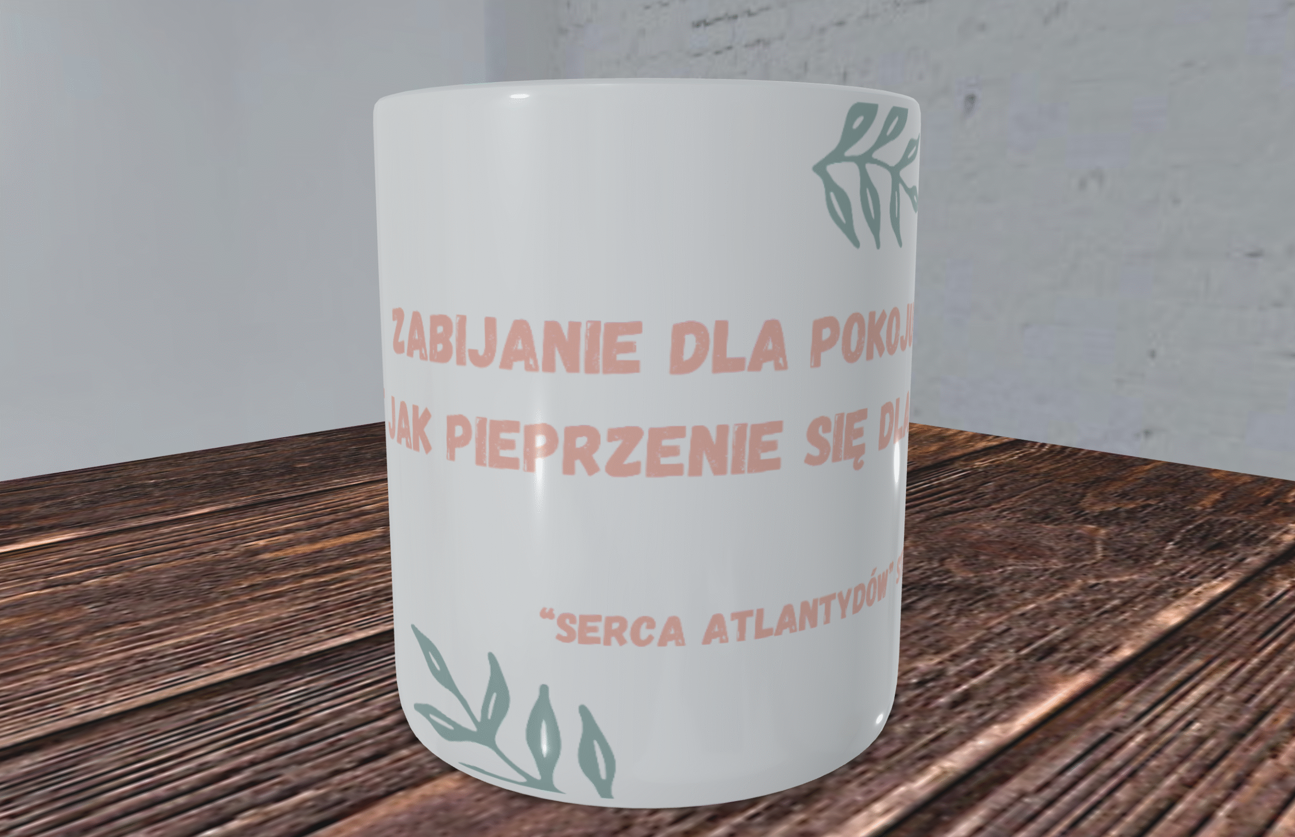 - Wzór: Minimalistyczny motyw roślinny oraz cytat z „Serc Atlantydów”