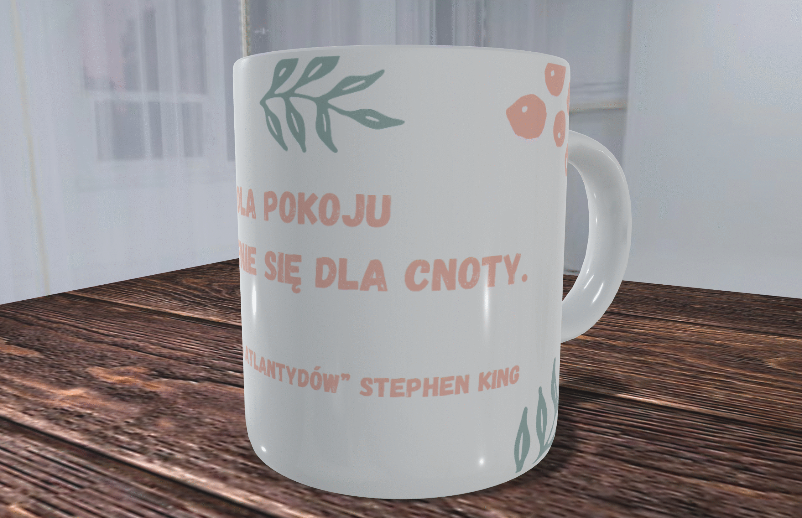 Na kubku znajduje się cytat z „Serc Atlantydów” Stephena Kinga: